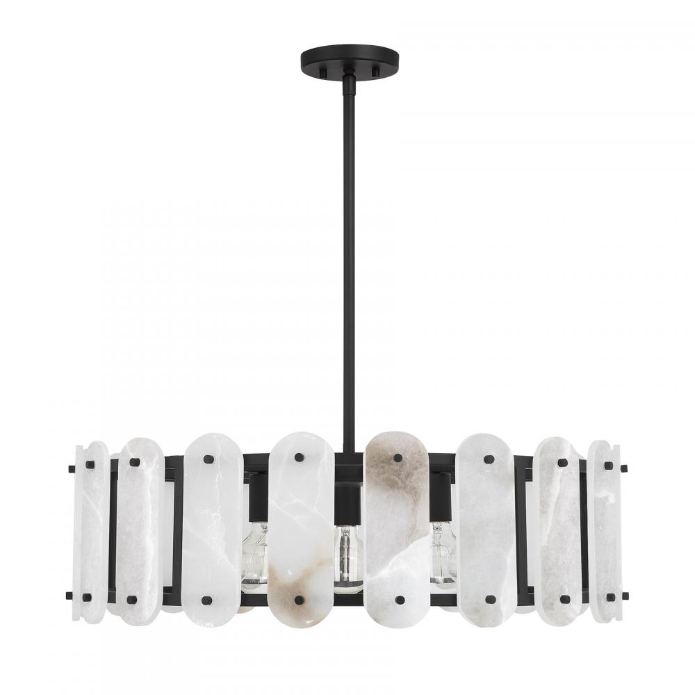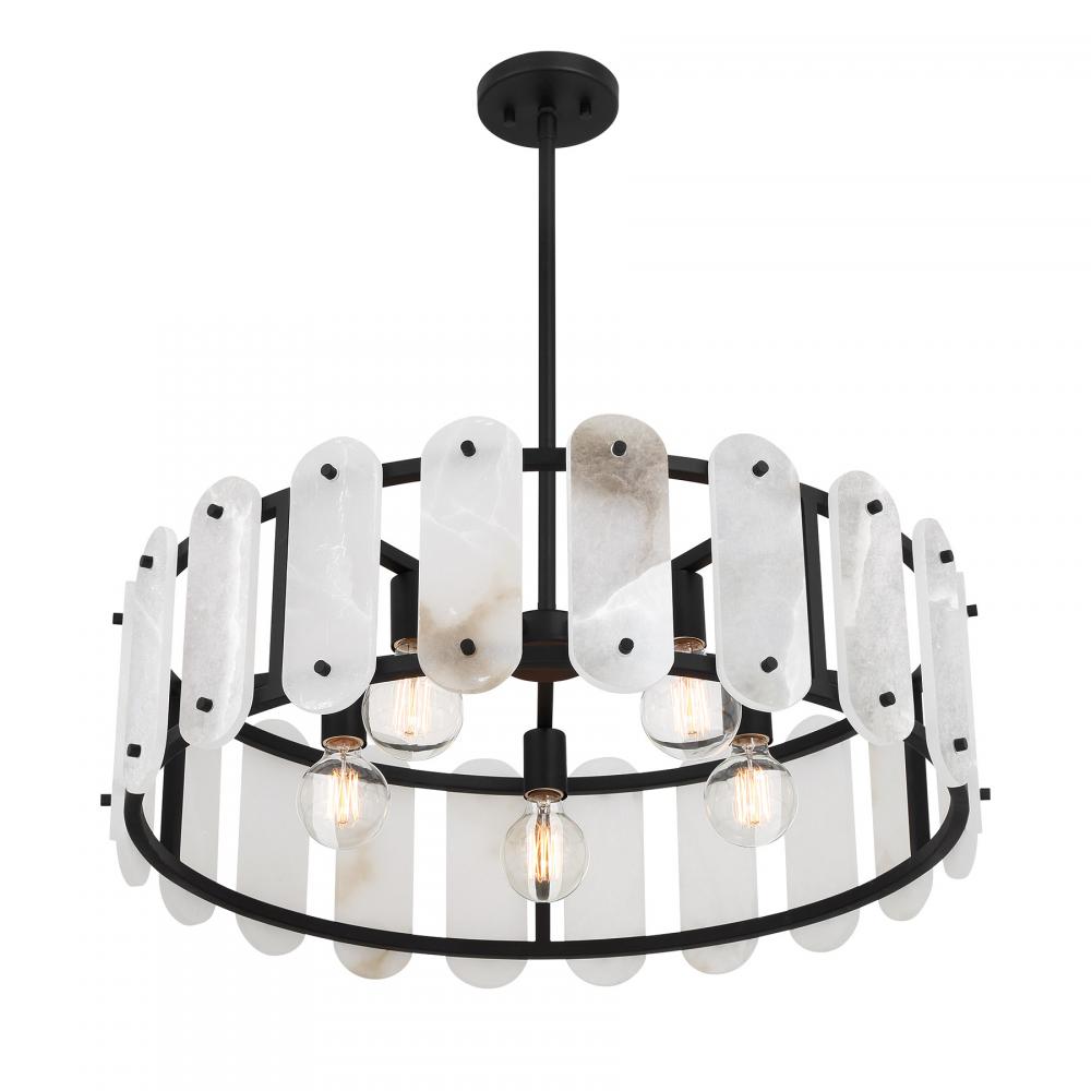 Discover spectacular lighting with the Savoy House Antolini 5-light pendant. Antolini is a reminder of the love and care that goes into sourcing precious materials from around the world. Panes of natural alabaster stone radiate ethereal warmth and vibrant veining, pairing perfectly with the Black Cashmere finished structure to create a stunning style that is reminiscent of jewelry. Antolini is 28.5" in width and has an adjustable height ranging from 8.38" to 62.38". It uses five standard size bulbs of up to 60 watts per bulb. Bulbs not included. Comes with four 12" downrods and one 6" downrod.