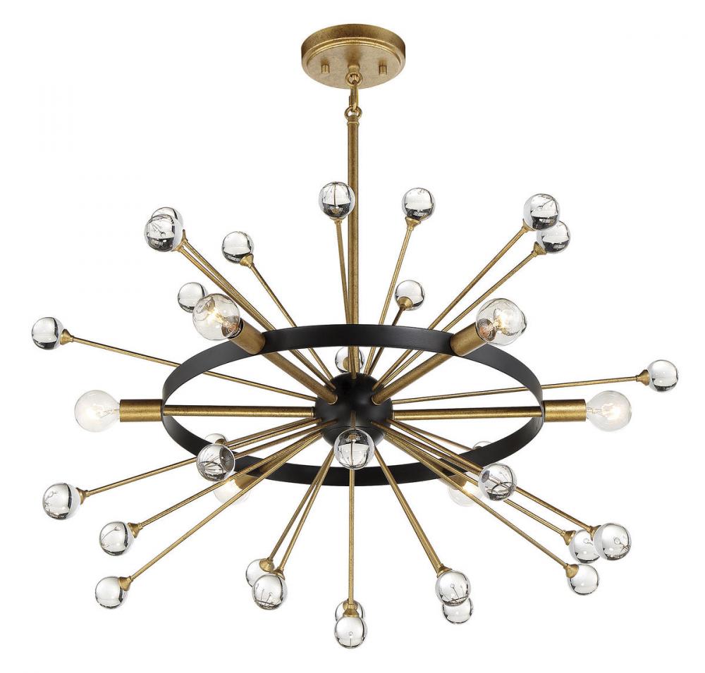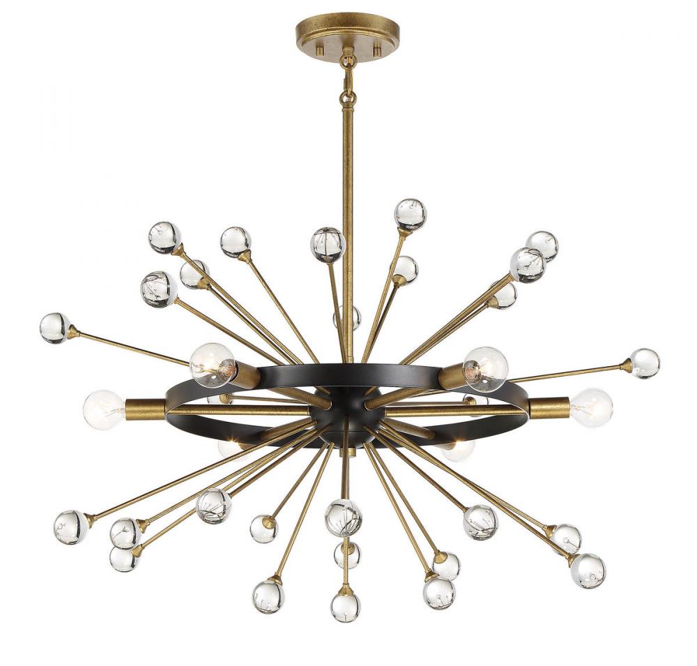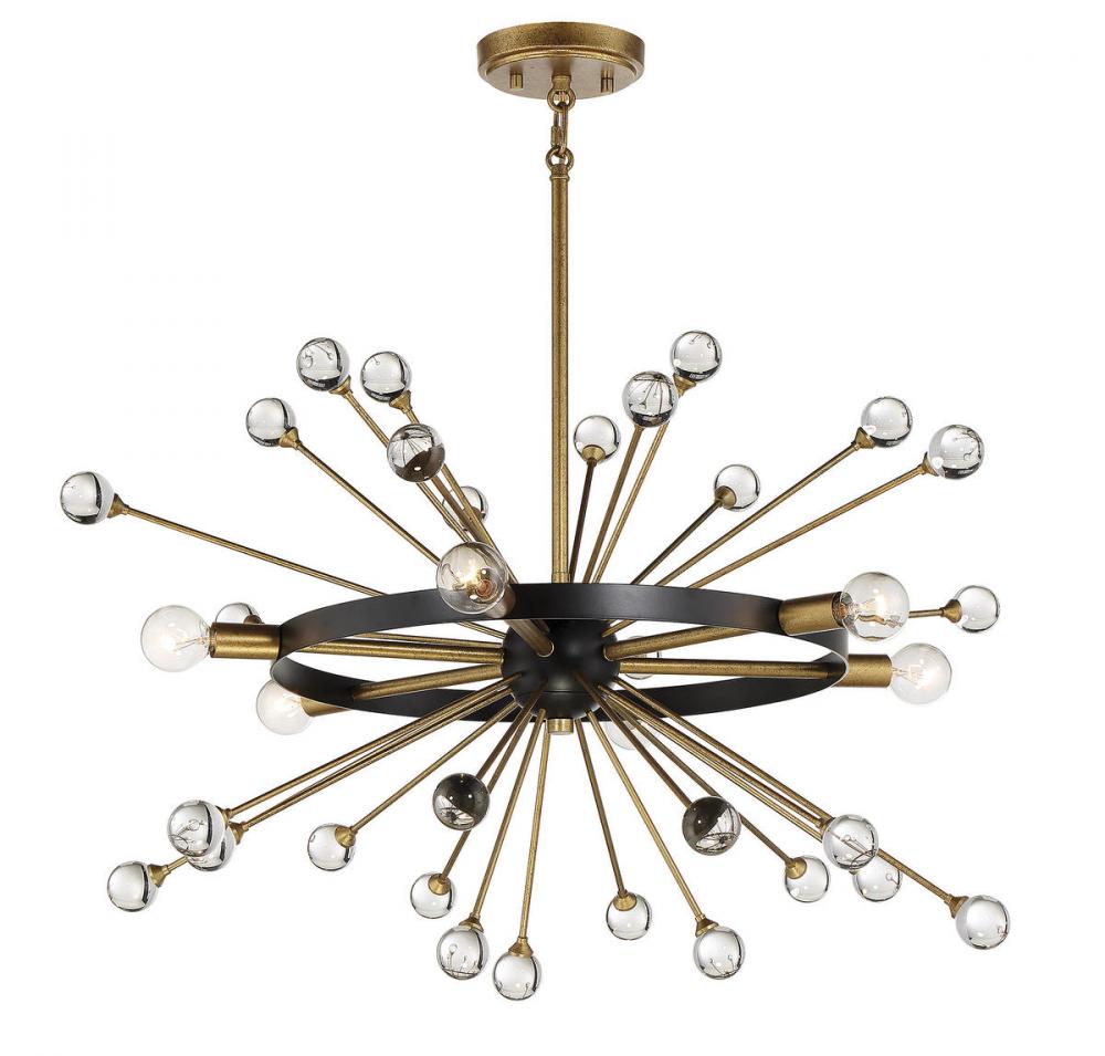 The Ariel 6-light chandelier from Savoy House offers a beautifully elegant and modern take on iconic Sputnik style. Slender Gold-finished arms topped with bulbs and crystal baubles emanate from a central sphere orbited by a ring finished in Como Black. Ariel is 25" in diameter and has an adjustable height ranging from 24" to 70". It uses six candelabra size bulbs of up to 60 watts max per bulb. Comes with four 12" downrods and one 6" downrod, plus 80" of chain.