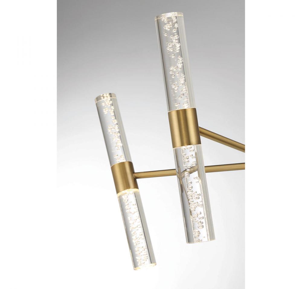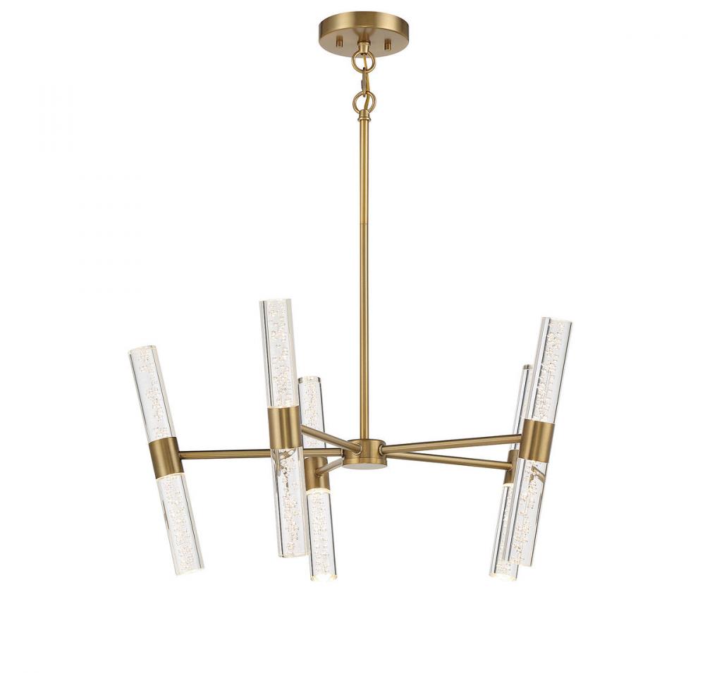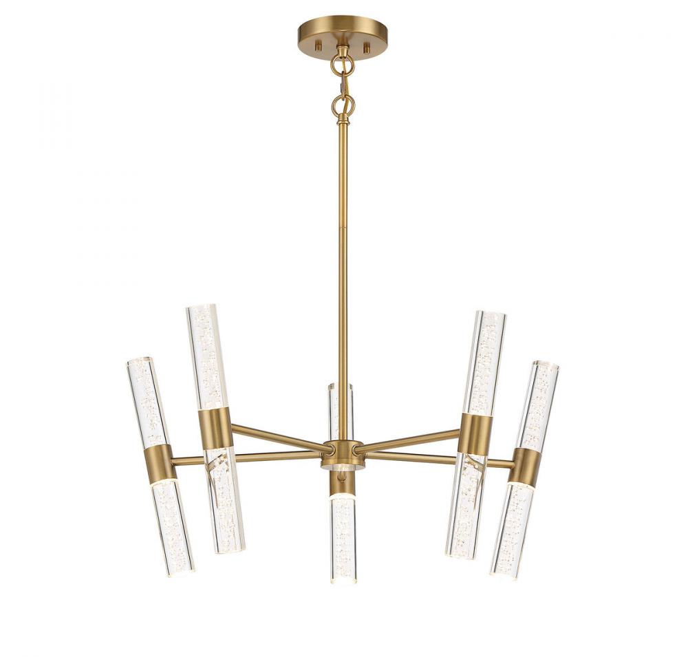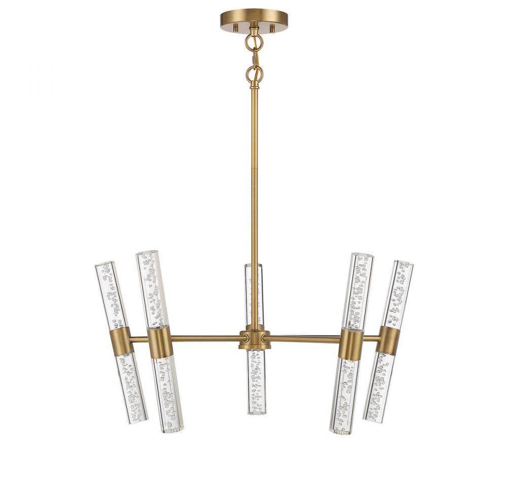 Let your lighting become the centerpiece of your room. The simply stunning Savoy House Arlon 10-light pendant makes that possible! Five arms, each topped with two wands of clear bubble glass, emerge from a central hub. The glass is illuminated from within by integrated LED light for an uninterrupted look. Warm brass finish. Arlon is 26" in diameter and has an adjustable height ranging from 23" to 77". Comes with four 12" downrods and one 6" downrod, plus 80" of cord.
