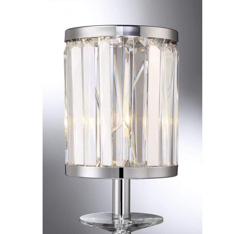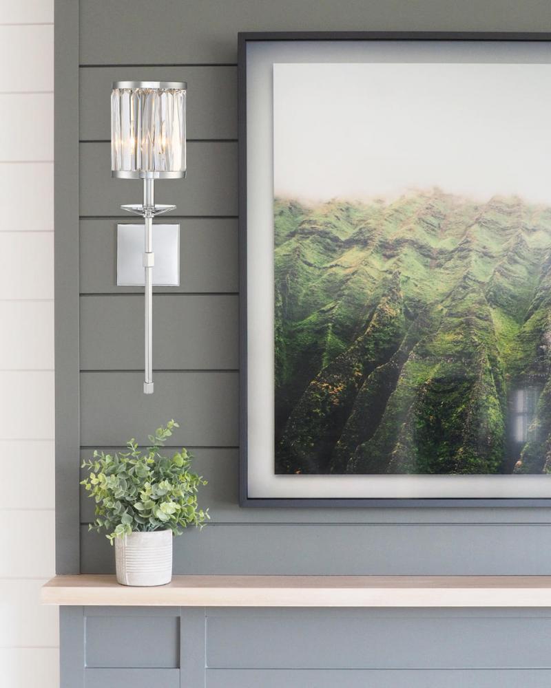 In the Savoy House Ashbourne, contemporary styling meets traditional materials for a wall sconce that’s right at home in your transitional or traditional decor. The light arm, wall plate and rims of the frame have a rich polished chrome finish. The frame is lined with beautiful rectangular clear crystals and there’s a decorative crystal just below the lamp too. One 60W candelabra size bulb within provides lovely illumination filtered through the crystals. The Ashbourne sconce is 6.5" wide, 26" high and extends 8" from the wall, making it a perfect size for your dining area, living room, entryway, great room, bedroom, bathroom, hallway, office, family room or stairway.