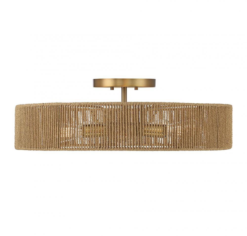 Featuring a slim, wide shade woven with rope, the Savoy House Ashe 5-light ceiling light is an ideal way to welcome relaxed organic style into your home. A warm brass finish makes for a harmonious pairing with the rope, too. Ashe is 8" in height and 24" in width. It uses five standard size bulbs of up to 60 watts per bulb.