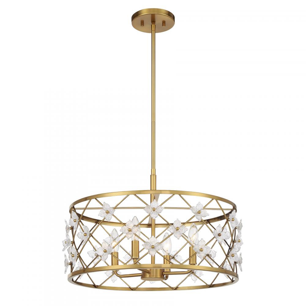 The Savoy House Bailey 4-light pendant offers a fresh take on a familiar form. The open drum-shaped shade is finished in Warm Brass and has a latticework pattern festooned with glass flowers. It mixes edgy with classic in an impeccable way and it can even be converted for use as a ceiling semi-flush mount light. Bailey is 20" in width and has an adjustable height ranging from 13.5" to 67.5". It uses four candelabra size bulbs of up to 60 watts per bulb. Bulbs not included. Comes with four 12" downrods and one 6" downrod.