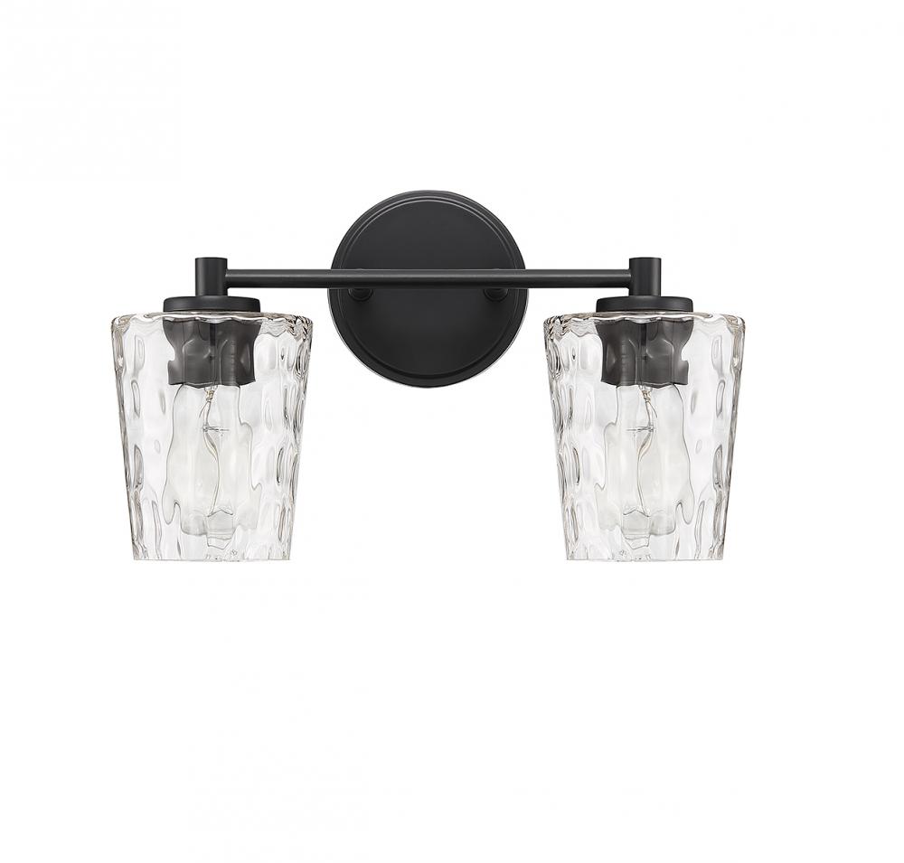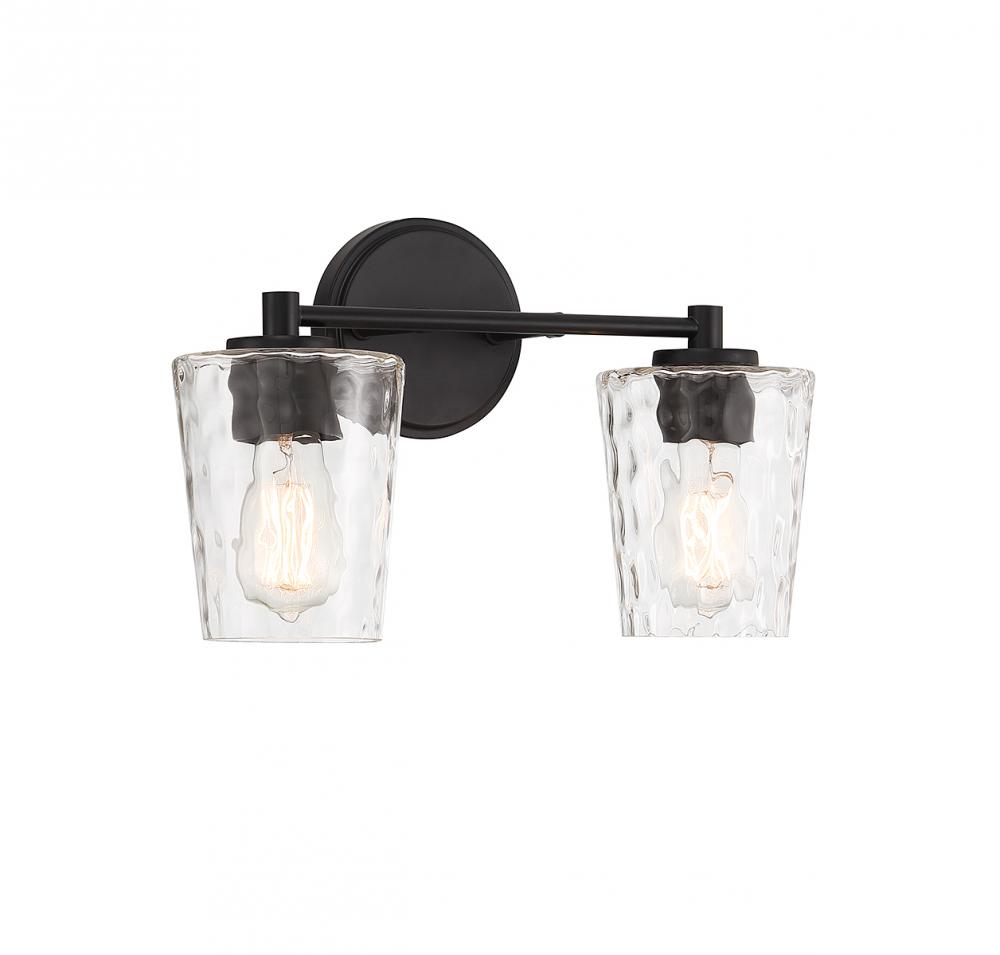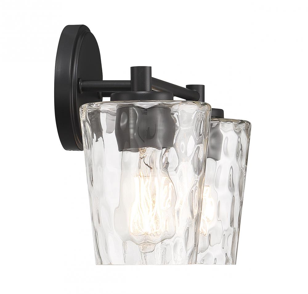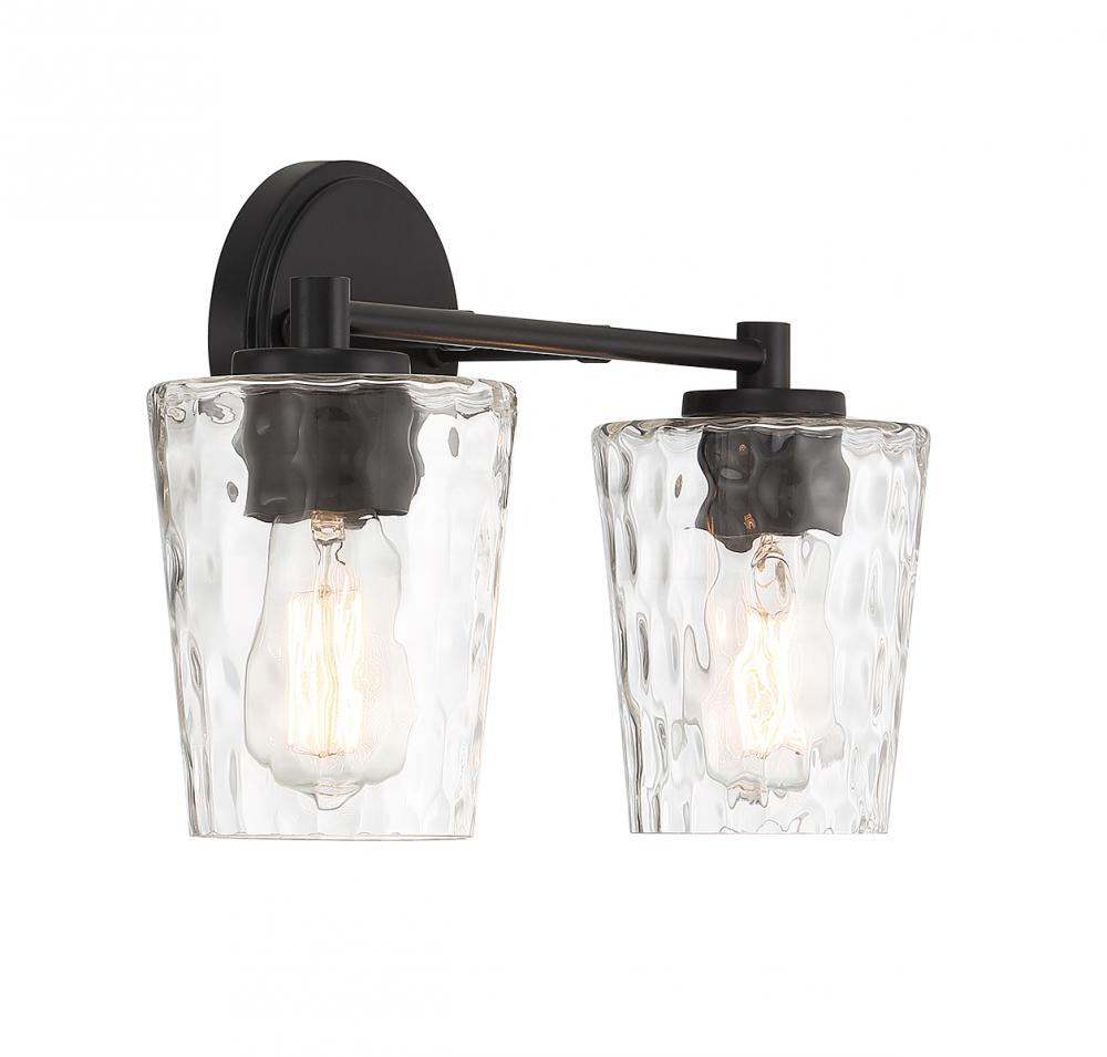 Add a hint of nature-inspired style to your bathroom with the Savoy House Ballas 2-light bath vanity light. Clear hammered glass shades give a watery effect for extra intrigue and dimension. Black finish. Ballas is 9.75" in height, 15.5" in width and extends 6.5" from the wall. It uses 2 standard size bulbs of up to 60 watts per bulb (bulbs not included).