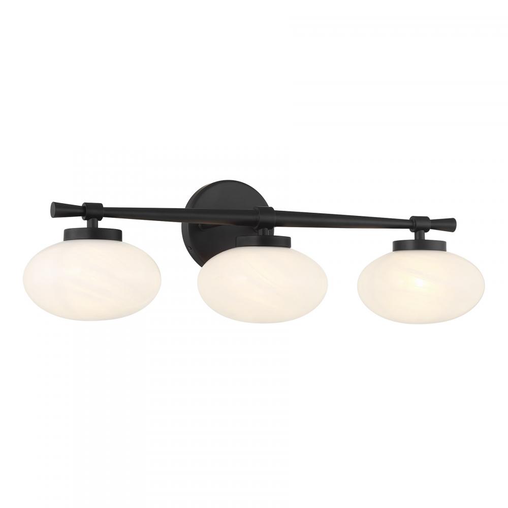 Add a hint of midcentury modern style to your bath with the Savoy House Barrow 3-light bath light. Oval-shaped shades of swirling, stunning strie glass hang down from stylized arms that are, like the round backplate, finished in Black. Barrow is 8" in height, 25" in width and extends 8" from the wall. It uses three G9 bulbs of up to 60 watts per bulb. Bulbs not included. Install as shown. This bath bar is damp area rated.