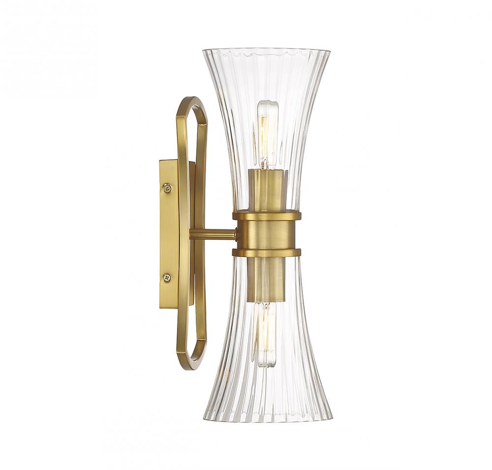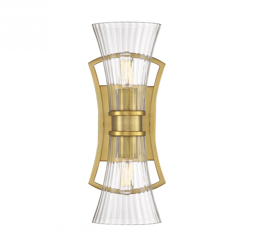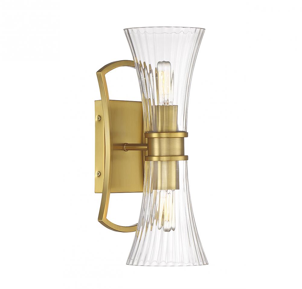 This Savoy House Bennington 2-light sconce features pleasantly curving shapes that combine to create an intriguing lighting look. Fluted clear glass shades and thoughtful detailing on the structure, finished in warm brass, gives the impression of motion. Bennington is 15" in height, 6.25" in width and extends 6.5" from the wall. It uses two candelabra size bulbs of up to 60 watts per bulb (bulbs not included).