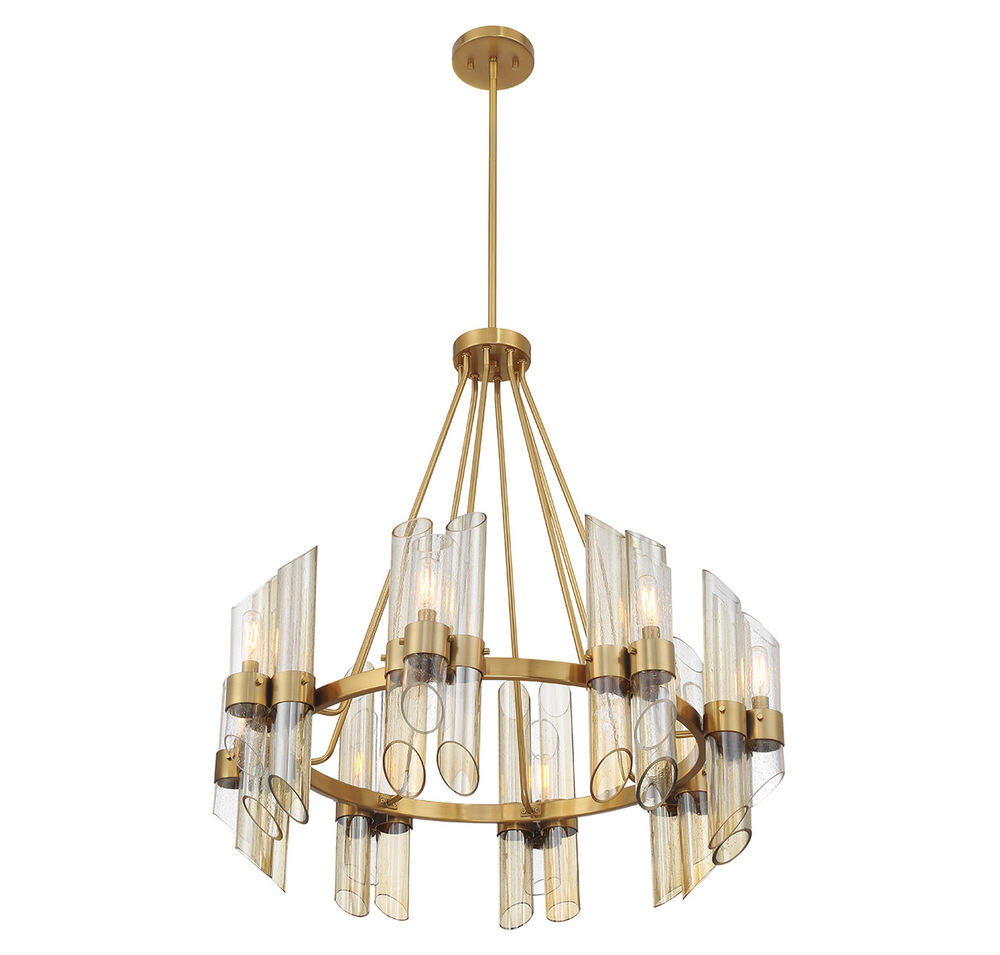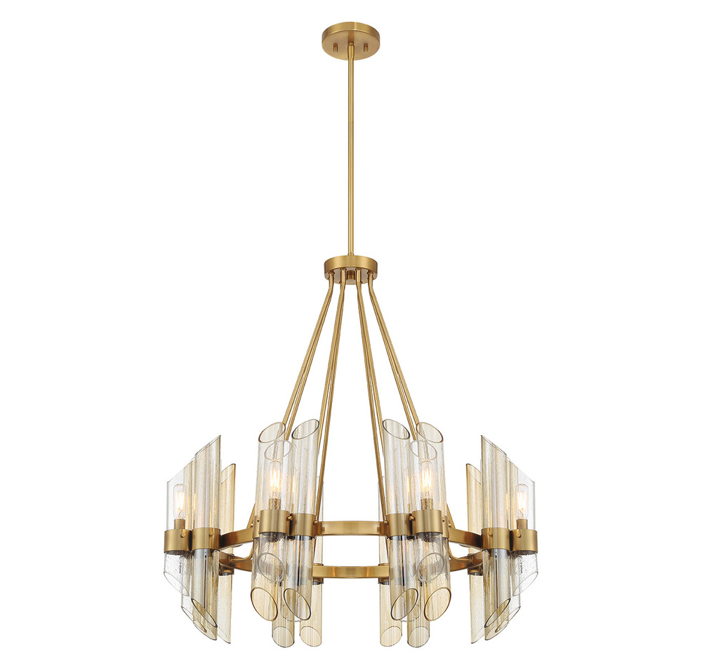 Adorn your home with the chic Art Deco style of the Savoy House Biltmore 8-light chandelier, which features pipes of marvelously multi-toned clear, champagne and smoked glass held in place by central belts finished in Warm Brass. Biltmore is 30" in width and has an adjustable height ranging from 31" to 85". Uses eight candelabra size bulbs of up to 60 watts per bulb. Bulbs not included.