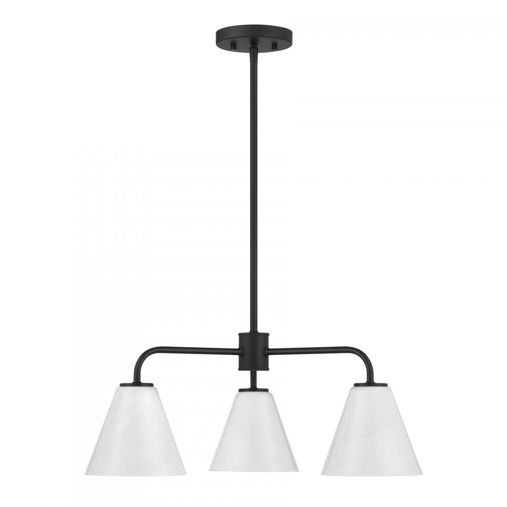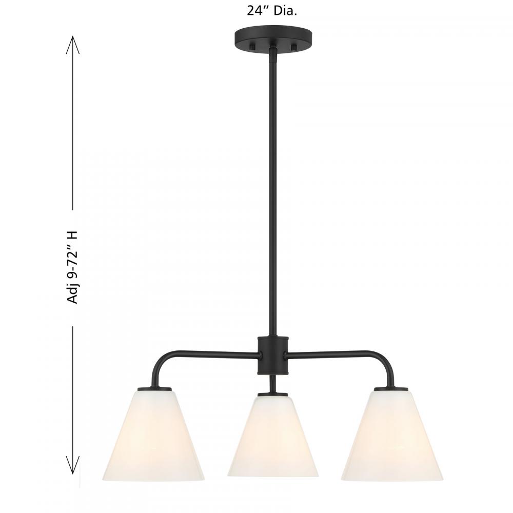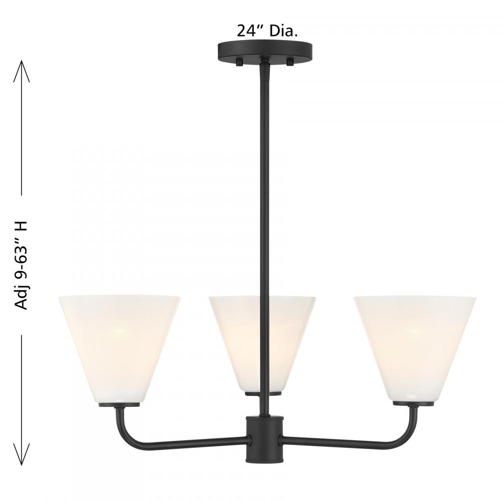 This Savoy House Blair 3-light chandelier is oh so versatile! It can be installed with the lights facing up or down, making it perfect for meeting every lighting need. Slender, sleek arms are finished in Matte Black and topped with shades of spectacularly swirling strie glass. Blair is 24" in width and has an adjustable height ranging from 9" to 63". Uses three standard size bulbs of up to 60 watts per bulb. Bulbs not included. Comes with four 12" downrods and one 6" downrod.