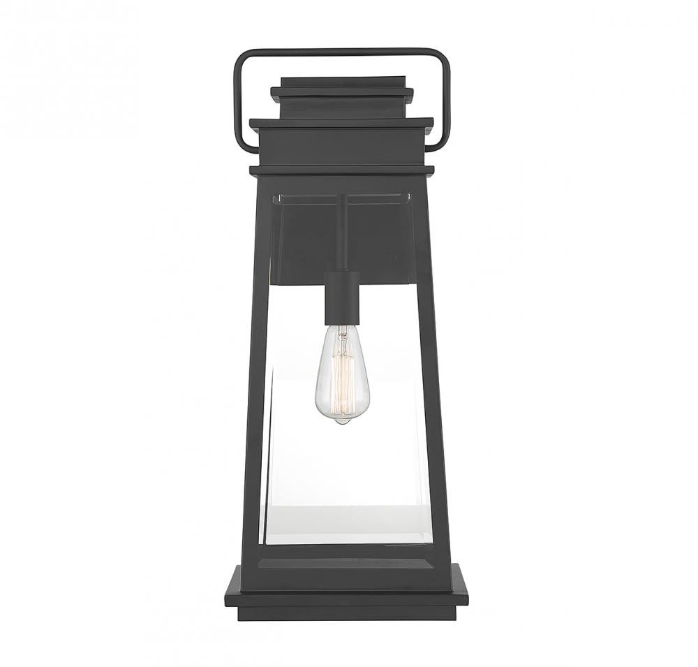 The Savoy House Boone 1-light outdoor wall light showcases a classic lantern-style lighting look with panes of clear beveled glass and a matte black finish that adds versatility. Boone is 24.75" in height, 10.25" in width and extends 11.5" from the wall. It uses 1 standard size bulb with a max of 60 watts (bulb not included).