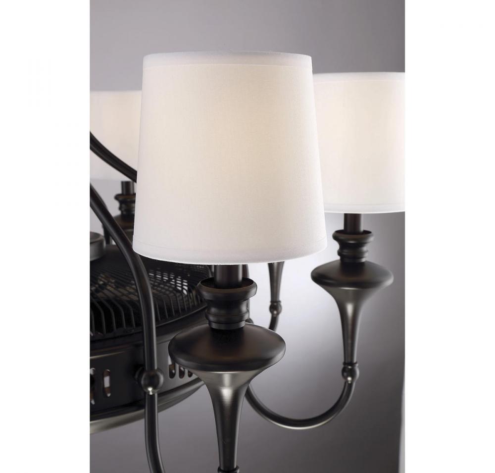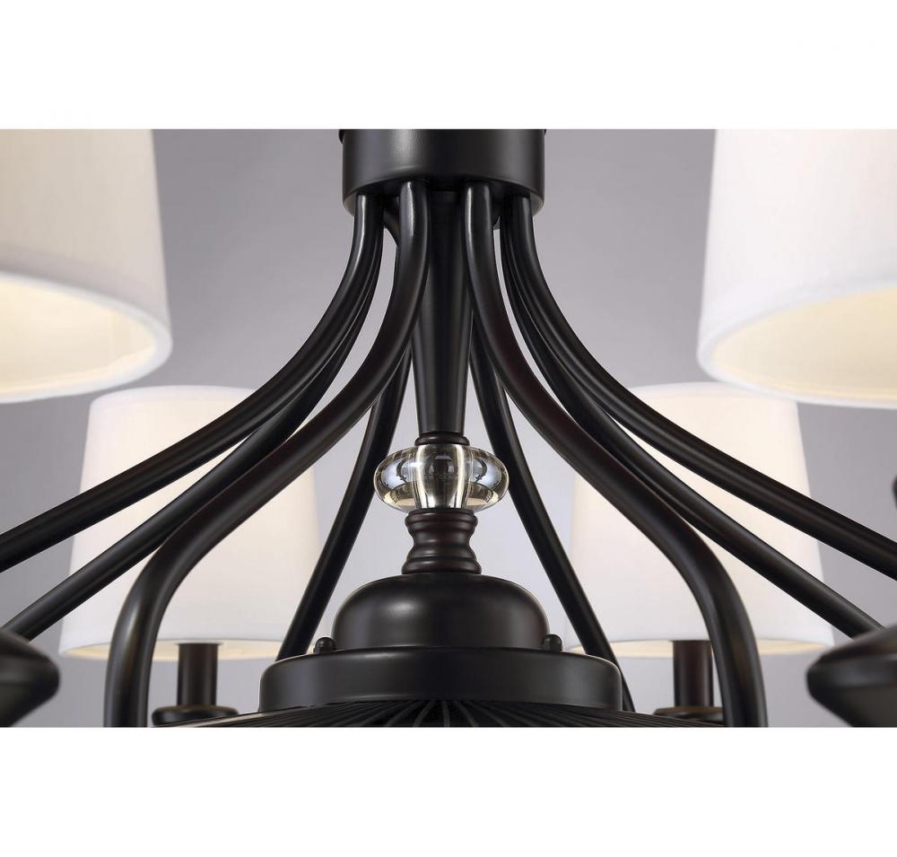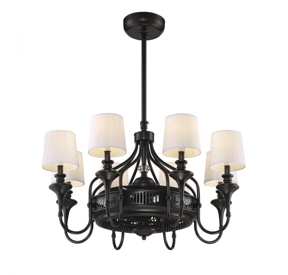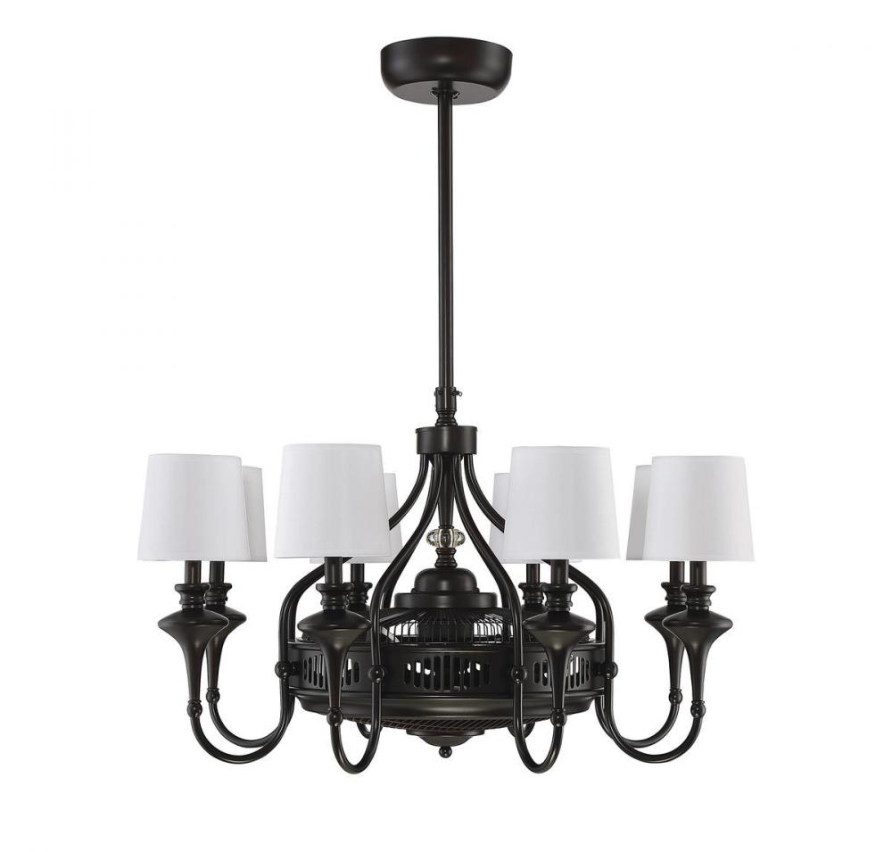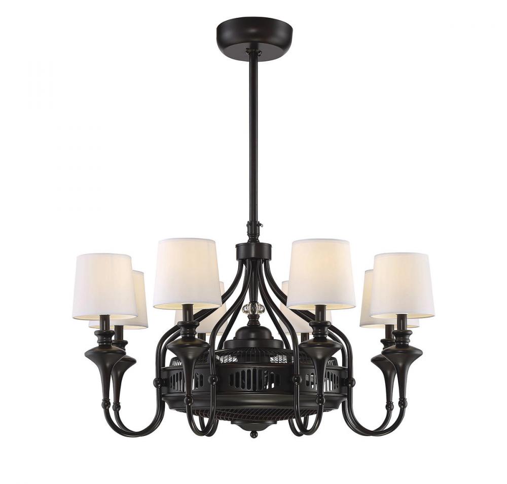 A classic chandelier design meets air circulation functionality in this Savoy House Brisa Fan D'Lier. Improve the comfort while you beautify your home with the elegance of this traditional style fixture. The graceful curved frame, upswept light arms, finial and detailed candle cups all have a rich, dark English bronze finish and each light has a tasteful off-white fabric drum shade. The fan housing features a decorative open grill structure for maximum air flow. Plus, eight 4W LED dimmable bulbs are included, so you can choose the perfect amount of illumination at any time. (A handheld remote with independent light control is included, too.) 34.75" wide and 24.13" high with an 18" downrod, so it’s ideal for your dining room, living room, family room, bedroom, enclosed porch or office.