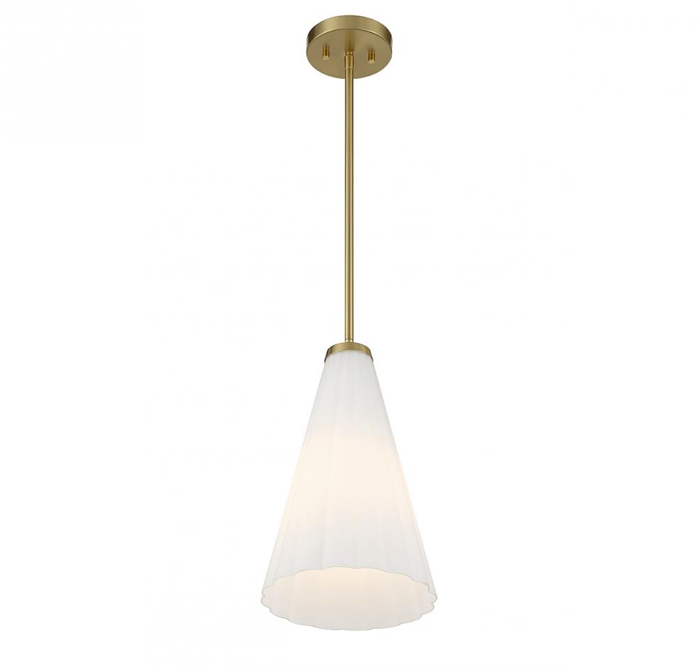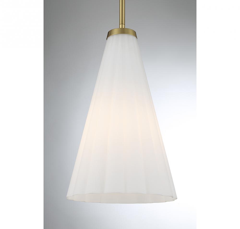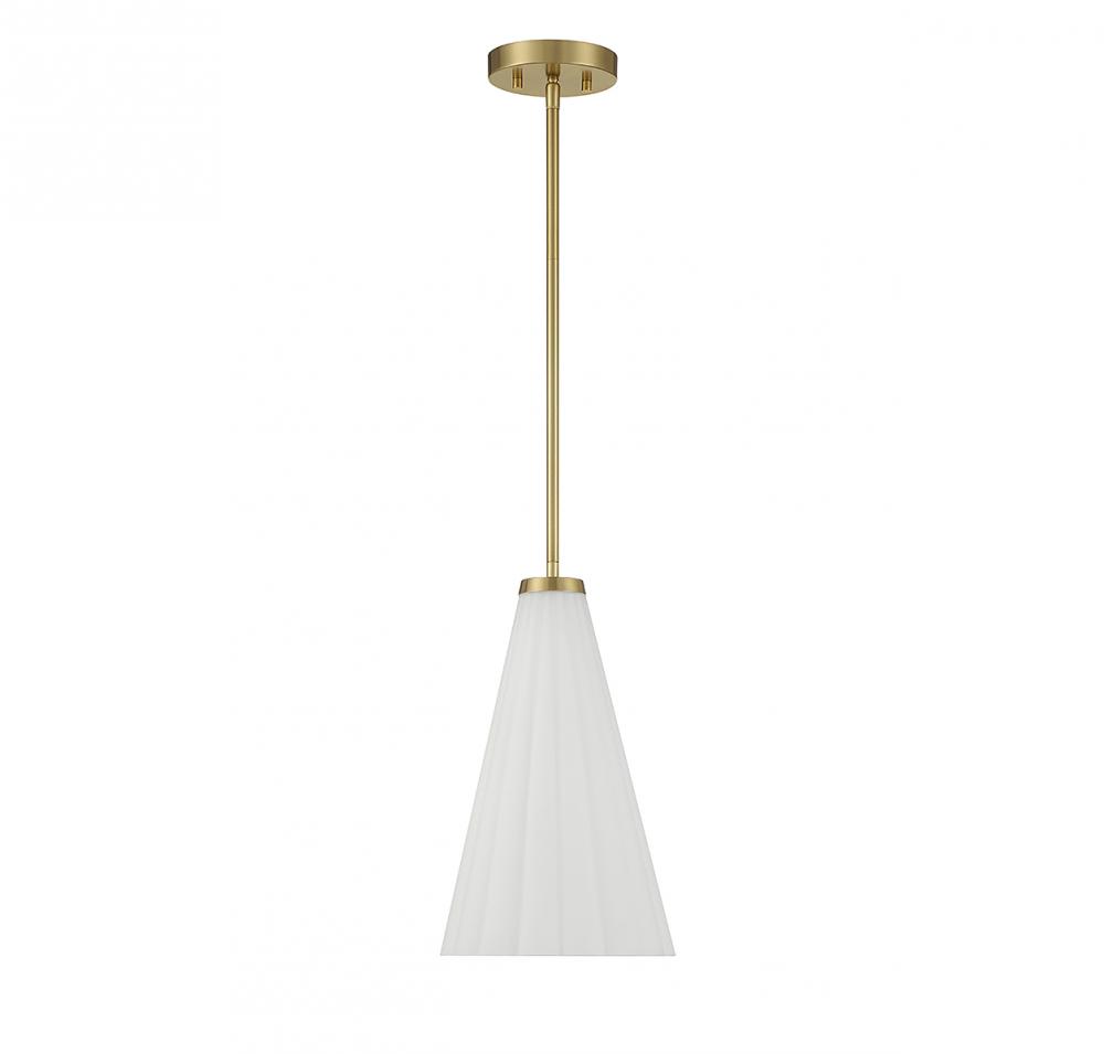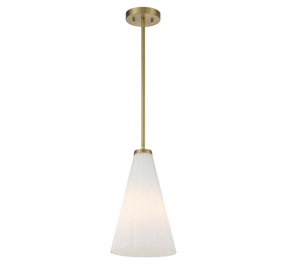With its elegantly fluted shade of white opal glass and a warm brass finish, this Savoy House Bristol 1-light pendant is a beautiful way to boost the light and style of a room. Use it solo or in groupings! Bristol is 9" in width and has an adjustable height ranging from 15.5" to 69". Comes with four 12" downrods and one 6" downrod. Uses 1 standard size bulb with a max of 60 watts (bulb not included).