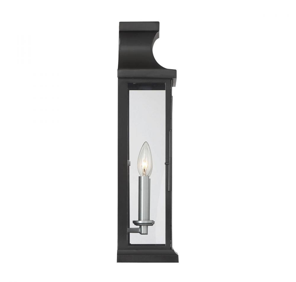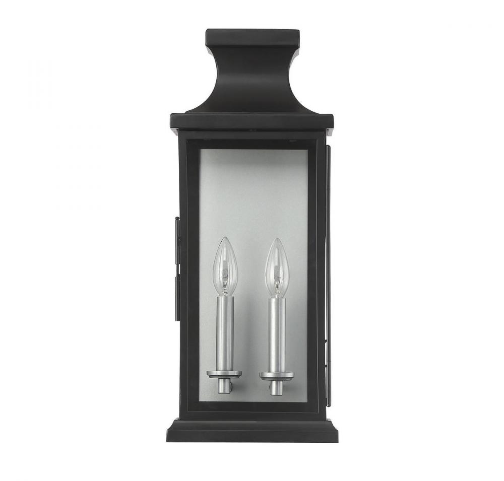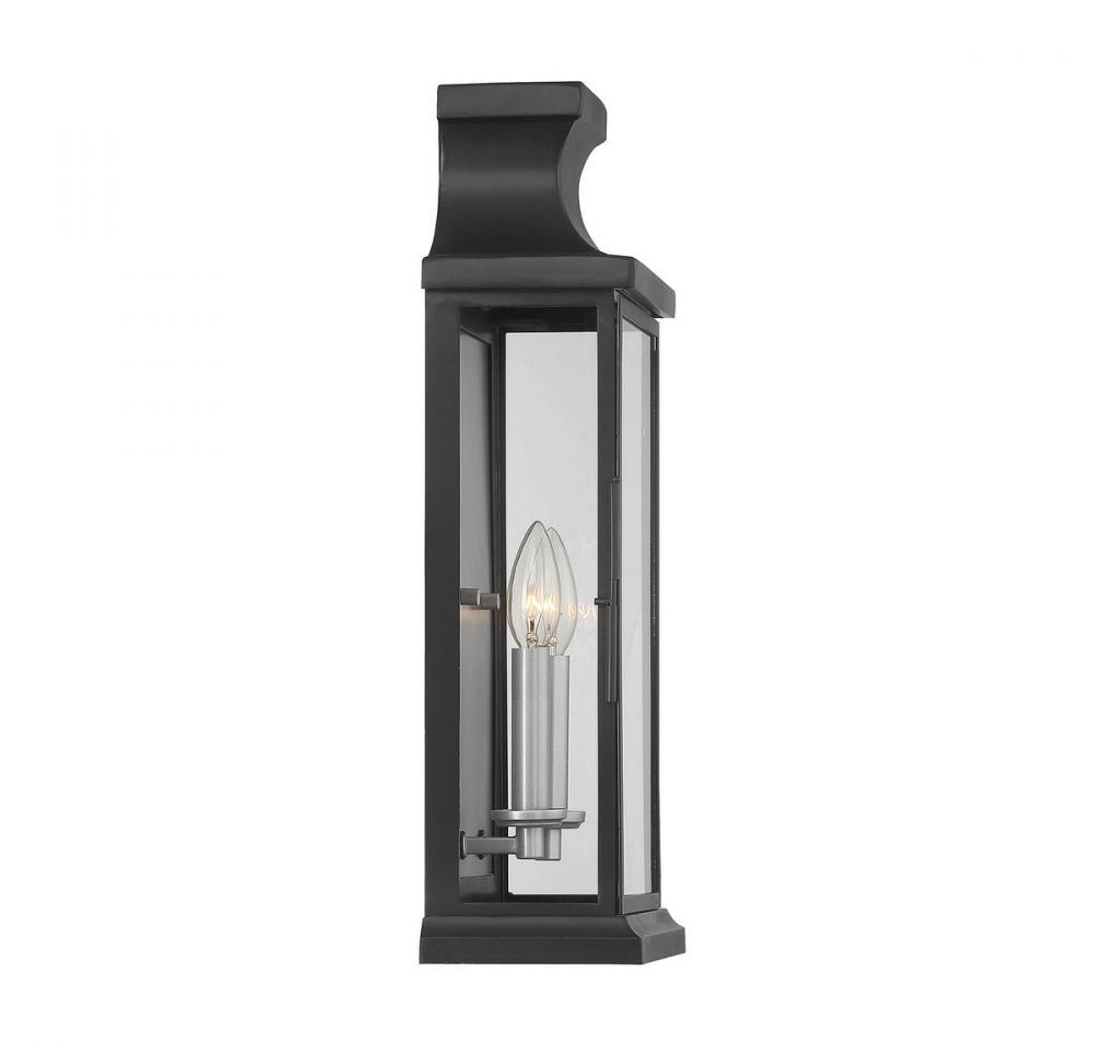 Welcome family and guests to your home in refined style. The Savoy House Brooke 2-light outdoor wall lantern has a streamlined traditional aesthetic for an uncluttered, polished look. The black finish looks great with everything and a slim, silvery candle tube adds a touch of simple luxury. The clean-lined, sculptural cornice has a classic shape and the rectangular frame has clear glass panels so two 60W candelabra size bulbs can really shine. This lantern measures 8.25" wide by 20" high and extends 5" from the wall. It’s a graceful, traditional wall lamp made from high quality materials to provide you with welcoming light for many years.