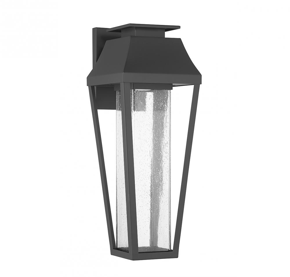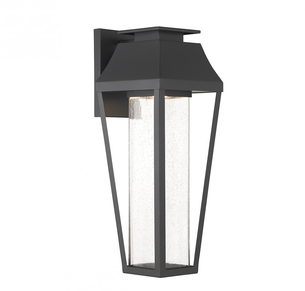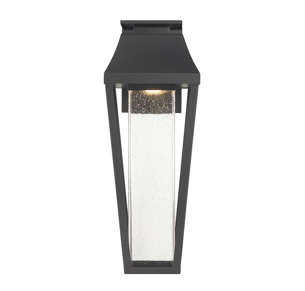 From Savoy House, the Brookline 1-light outdoor wall light showcases a more contemporary take on classic lantern-style illumination with a central column of clear seeded glass illuminated by integrated LED light. The matte black finish adds versatility. Brookline is 20" in height, 7.25" in width and extends 9" from the wall.
