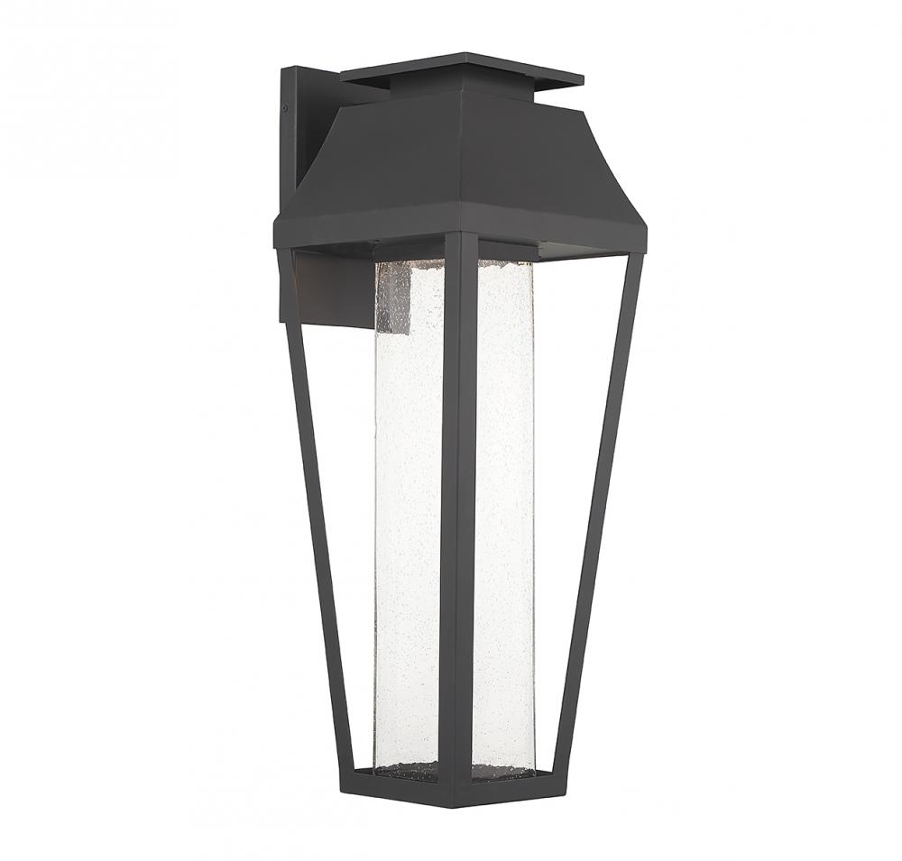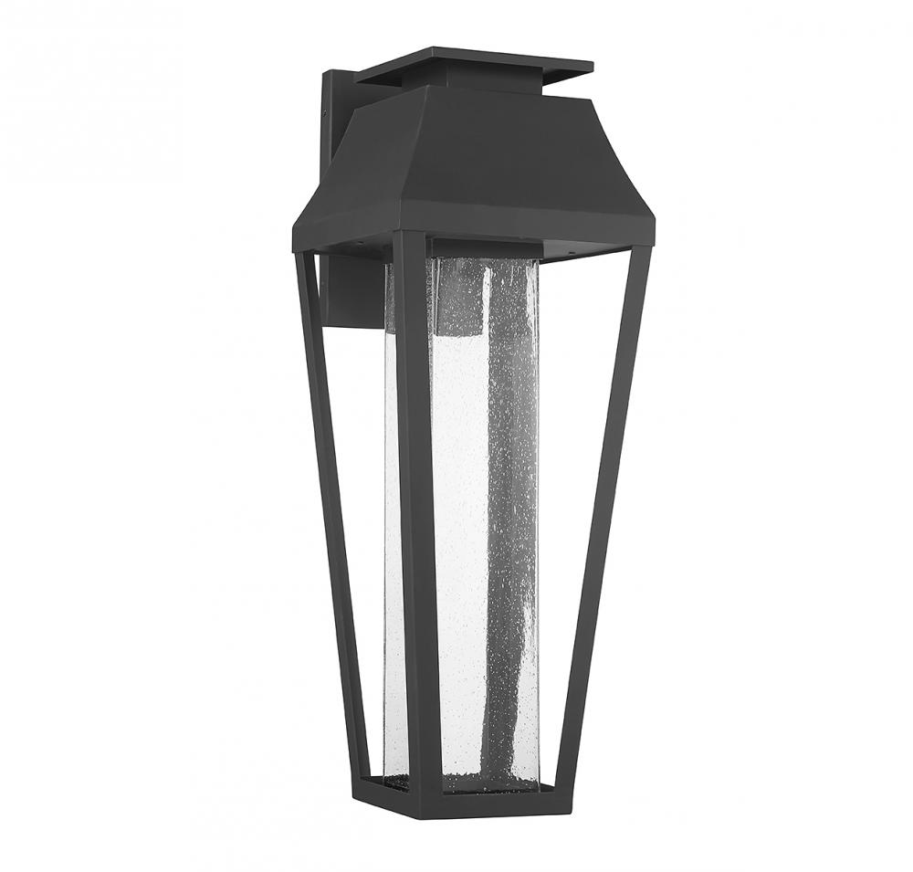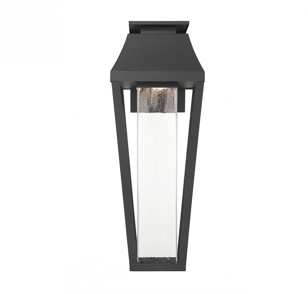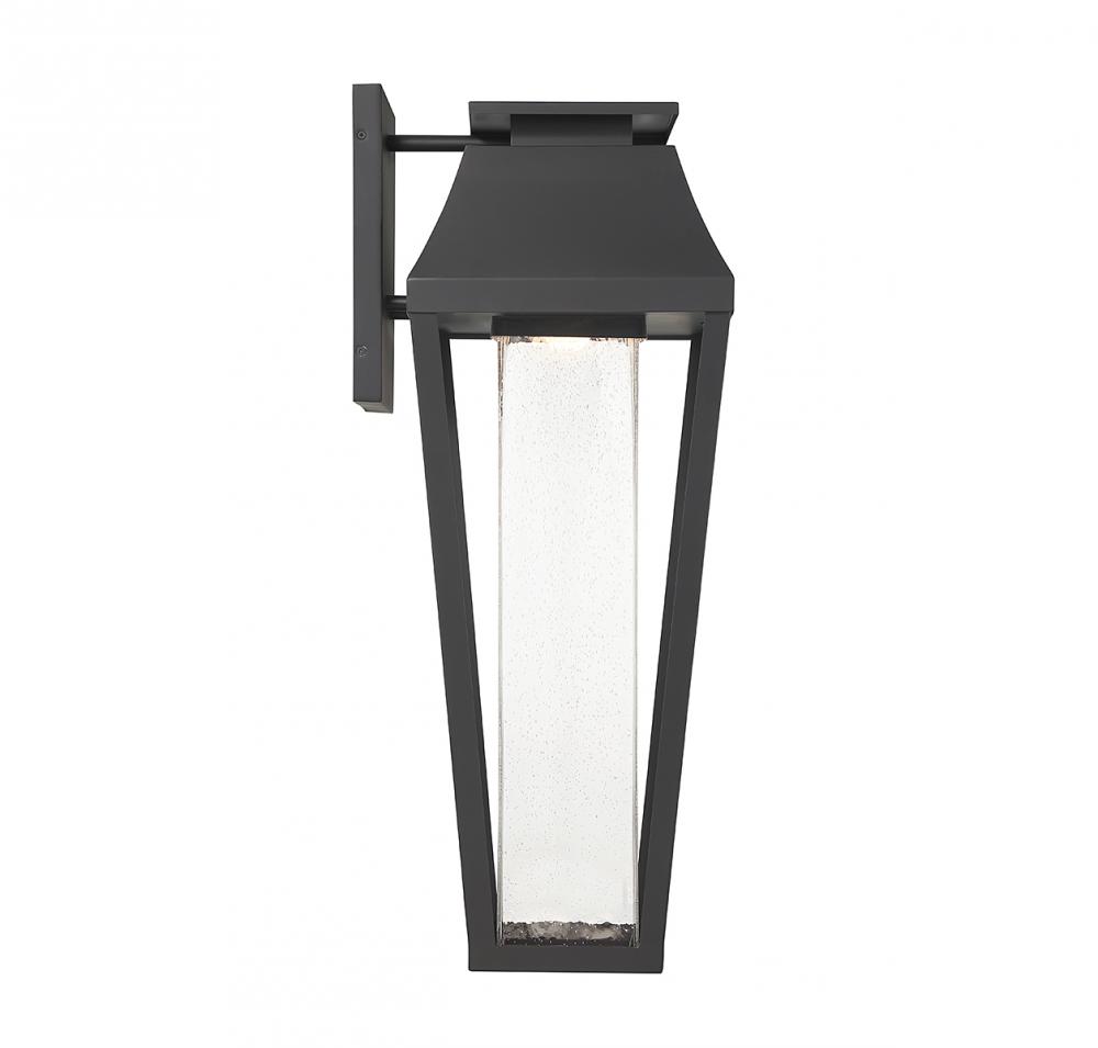 From Savoy House, the Brookline 1-light outdoor wall light showcases a more contemporary take on classic lantern-style illumination with a central column of clear seeded glass illuminated by integrated LED light. The matte black finish adds versatility. Brookline is 32.25" in height, 12" in width and extends 14" from the wall.