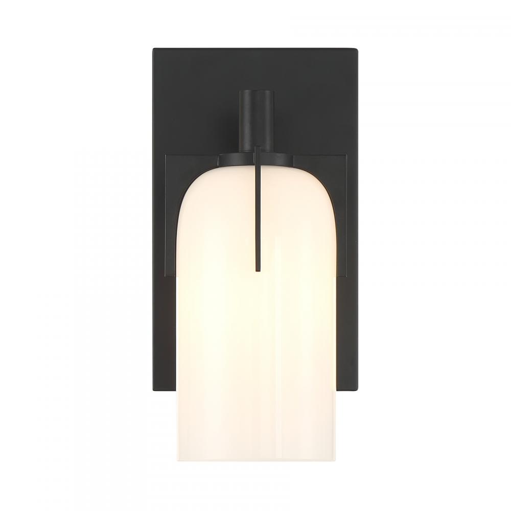 Bring fashionable, vintage-inspired lighting home with the Savoy House Caldwell 1-light sconce. An etched white opal glass shade is held in place with dramatic jewelry-like prongs that are finished in Matte Black. Caldwell is 9.5" in height, 4.75" in width and extends 5.5" from the wall. It uses one candelabra size bulb of up to 60 watts. The bulb is not included. This sconce is damp area rated and must be installed as shown.