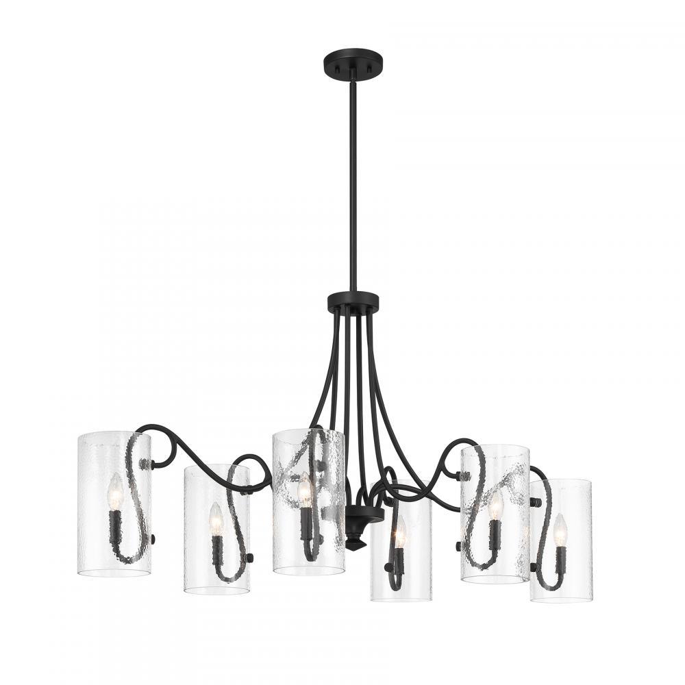 Heighten the drama with the Savoy House Calgary 6-light oval chandelier. Slim, boldly curling arms are each topped with a cool cylinder of clear hammered glass for added texture. Finished in Matte Black. Calgary is 48" in length, 25" in width and has an adjustable height ranging from 24" to 78", making it an excellent choice for illuminating large spaces. Comes with four 12" downrods and one 6" downrod. Uses six candelabra size bulbs of up to 60 watts per bulb. Bulbs not included.