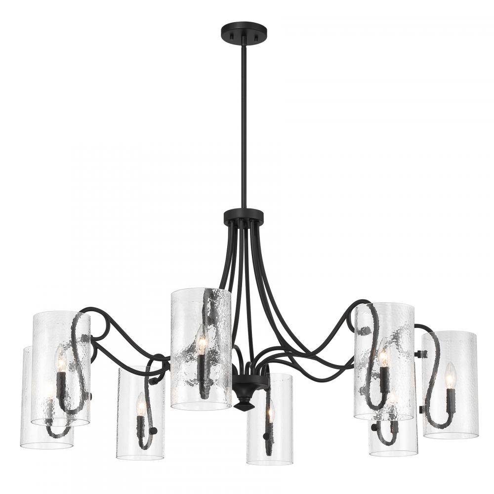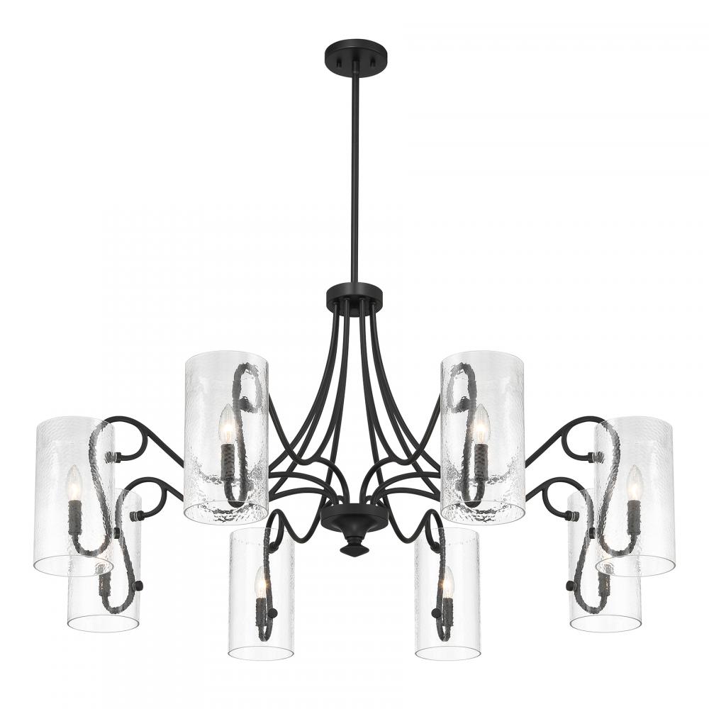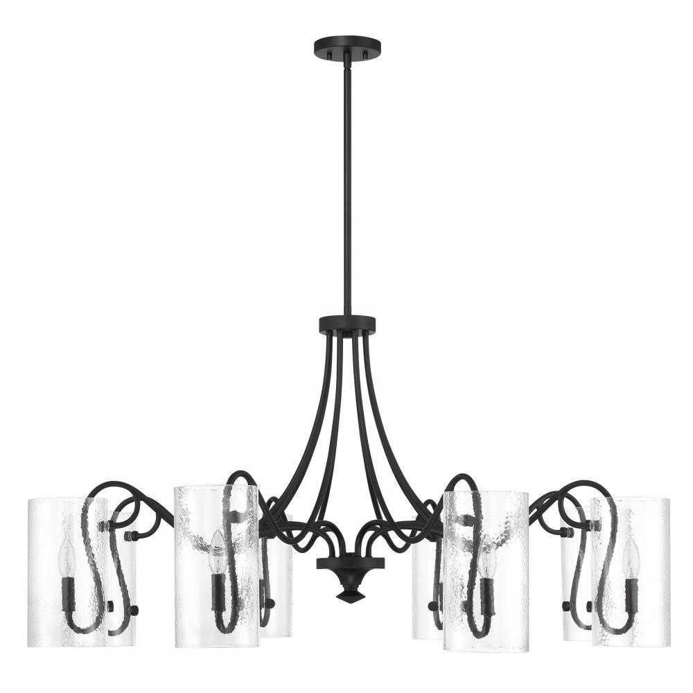 Heighten the drama with the Savoy House Calgary 8-light chandelier. Slim, boldly curling arms are each topped with a cool cylinder of clear hammered glass for added texture. Finished in Matte Black. Calgary is 48" in width and has an adjustable height ranging from 26.5" to 80.5", making it an excellent choice for illuminating large spaces. Comes with four 12" downrods and one 6" downrod. Uses eight candelabra size bulbs of up to 60 watts per bulb. Bulbs not included.