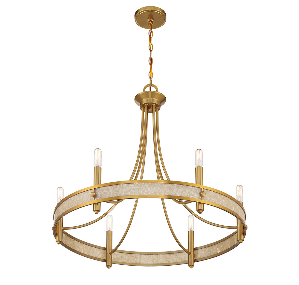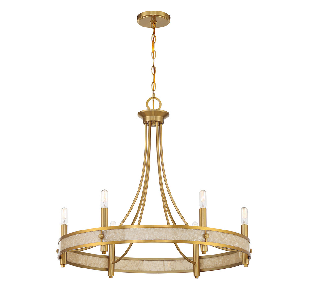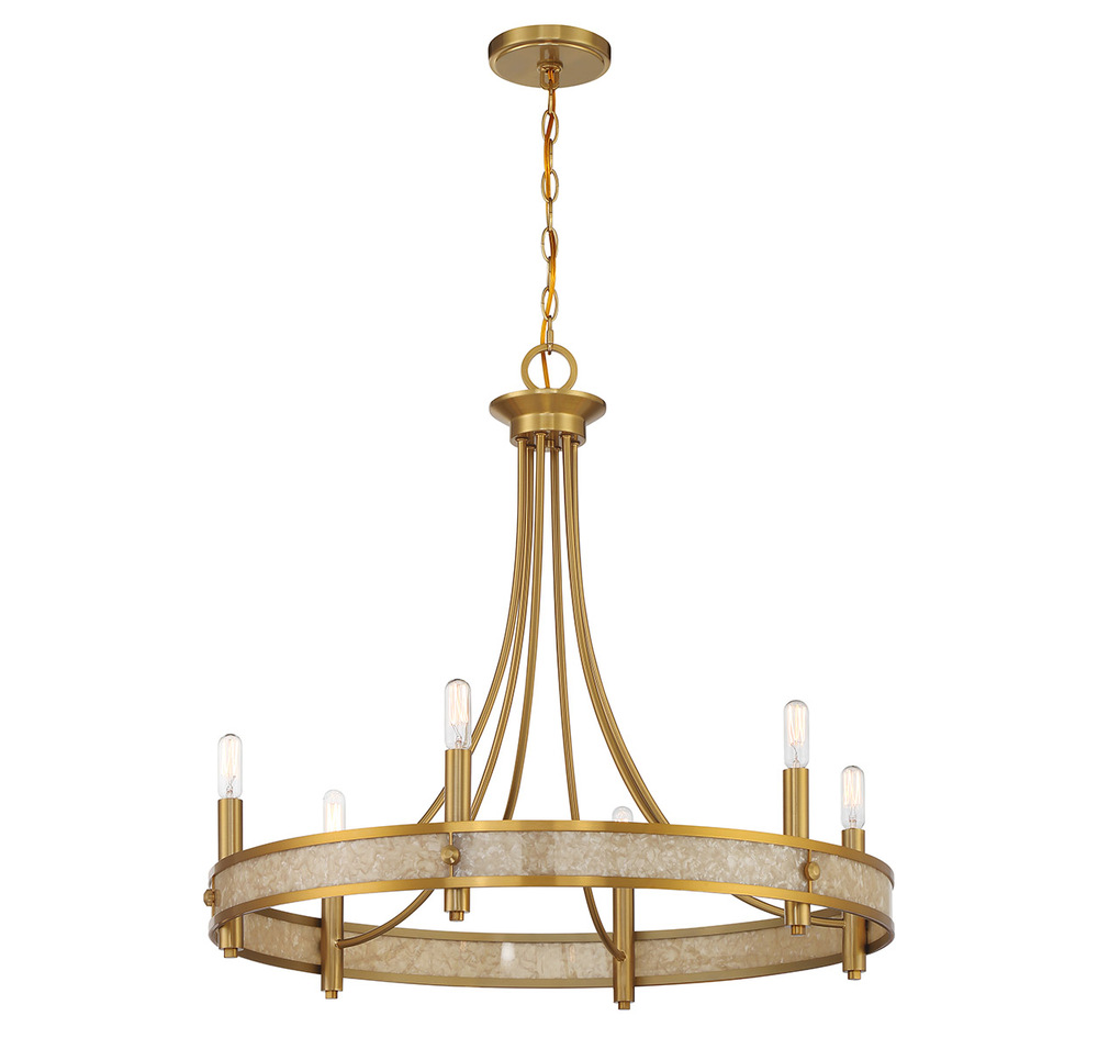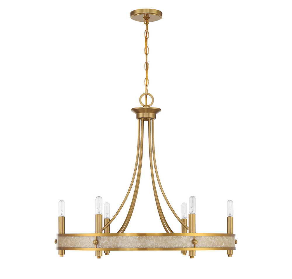 This brilliantly beautiful Savoy House Camden 6-light chandelier lets you bring a nature-inspired glow to your home. Shell accents with swirling patterns add a layer of wonder while the Warm Brass finish adds richness. Camden is 25" in height and 28" in width. Uses six candelabra size bulbs of up to 60 watts per bulb. Bulbs not included.