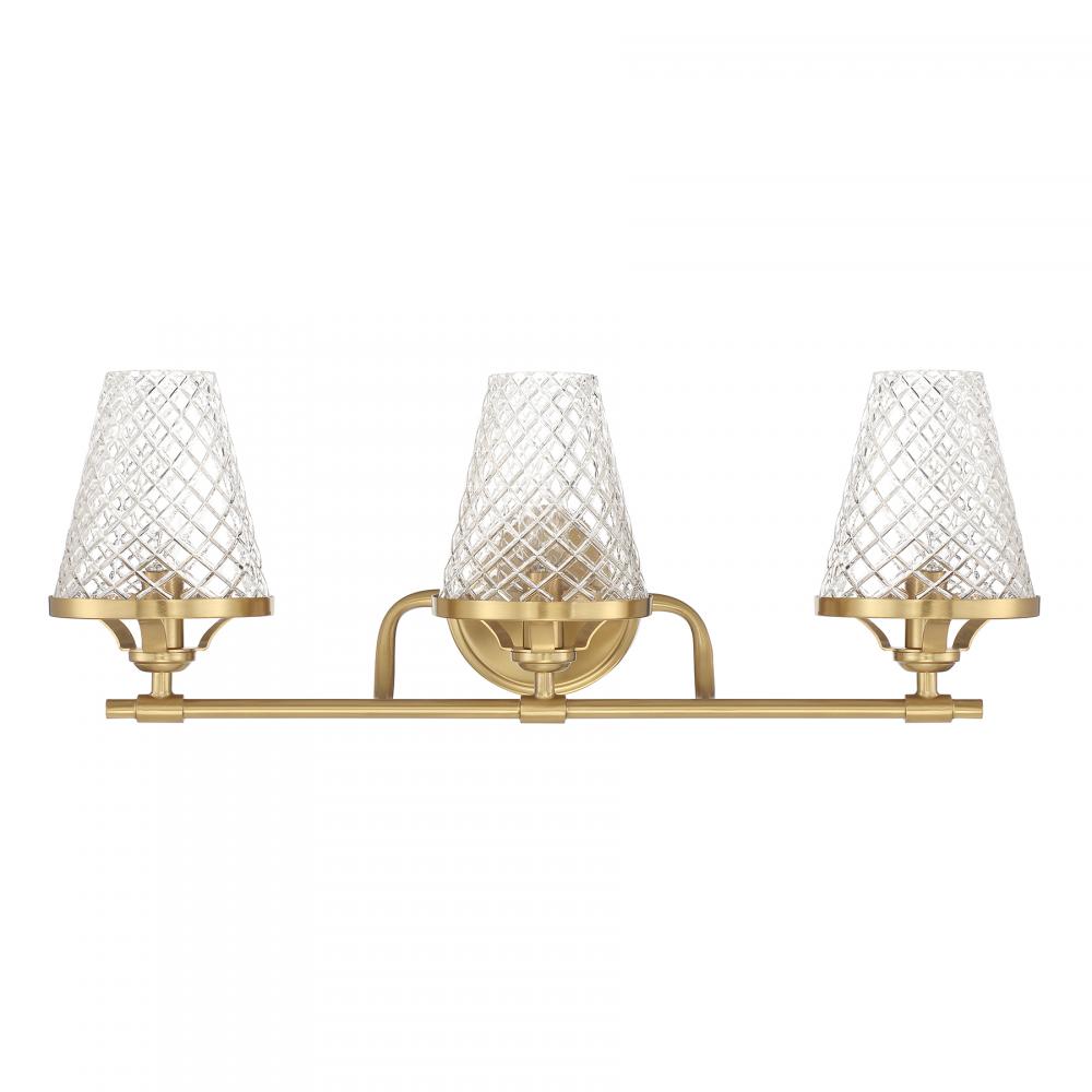 Infuse a bathroom with the vintage-inspired charm of the Candler 3-light bath bar from Savoy House. Three shades of tapered clear glass showcase a diamond pattern that adds texture, heightens the drama and recalls beautiful antique glassware. Warm Brass finish. Candler is 8.75" in height, 24" in width and extends 7.5" from the wall. Uses three candelabra size bulbs of up to 60 watts per bulb. Bulbs not included. This bath light is damp area rated and must be installed as shown.