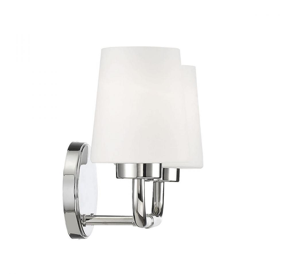 Add chic style to any bathroom with the Savoy House Capra 2-light bath bar. Its substantial structure features classic details along with white opal glass shades that are tapered like lamp shades and open at the top to give off a flattering glow. The large oval-shaped backplate helps to cover up any holes left behind from replacing old bath bars, too. Plus, the hardware for this fixture has been thoughtfully moved to the side of the backplate, allowing for a crisp and clean look. Finished in polished nickel. This fixture is 15" wide and 9" tall. It extends 6.5" from the wall. Uses 2 standard size bulbs of up to 60 watts each (not included).