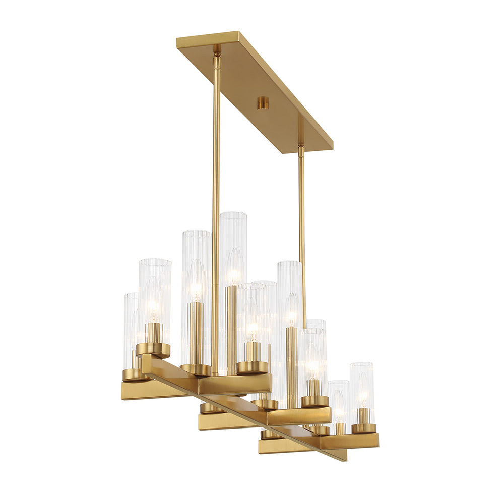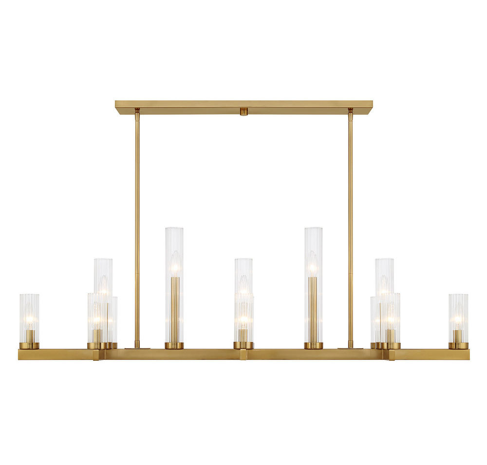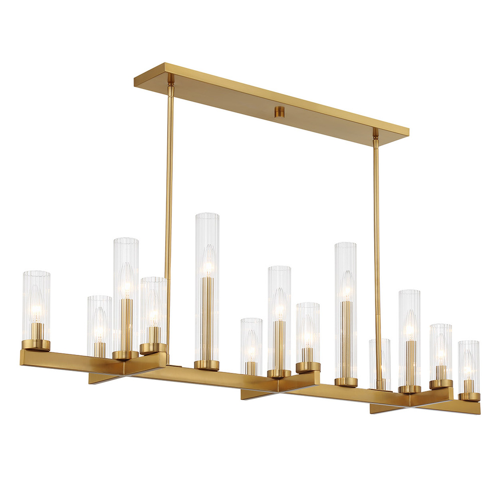 This effortlessly elegant Savoy House Carina 13-light linear chandelier features a beautiful Warm Brass finish and lights standing at different heights, creating a pleasing pattern that is sure to draw attention. Each light is encased in a clear ribbed glass shade to add texture. Carina is 47.5" in length, 10" in width and has an adjustable height ranging from 14" to 56". Comes with eight 12" downrods and two 6" downrods. Uses thirteen candelabra size bulbs of up to 60 watts per bulb. Bulbs not included.