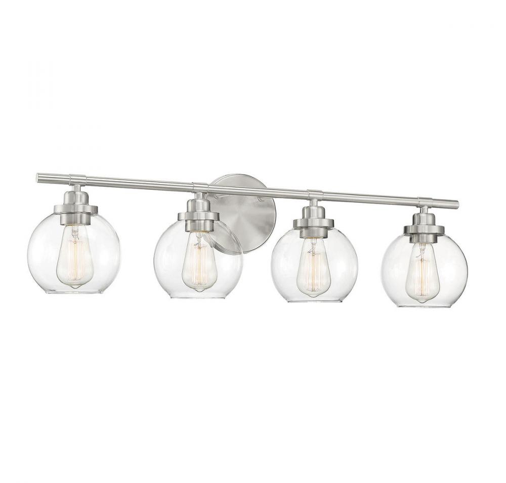 Adding the Savoy House Carson 4-light bath bar easily helps you boost the illumination and the style of any bathroom. Its fishbowl-style clear glass shades make a big statement and are open at the bottom, making it easy to replace the bulbs. The streamlined structure offers up subtle detailing with a mid-century modern vibe and the circular backplate echoes the shape of the glass shades. Finished in satin nickel. This fixture is 30" wide and 8.5" tall. It extends 7" from the wall. Uses 4 standard size bulbs of up to 60 watts each (not included).
