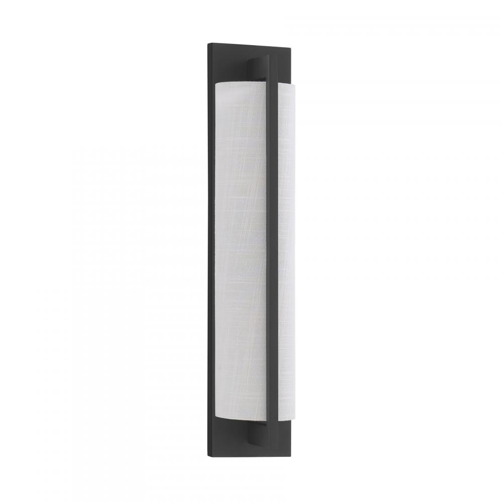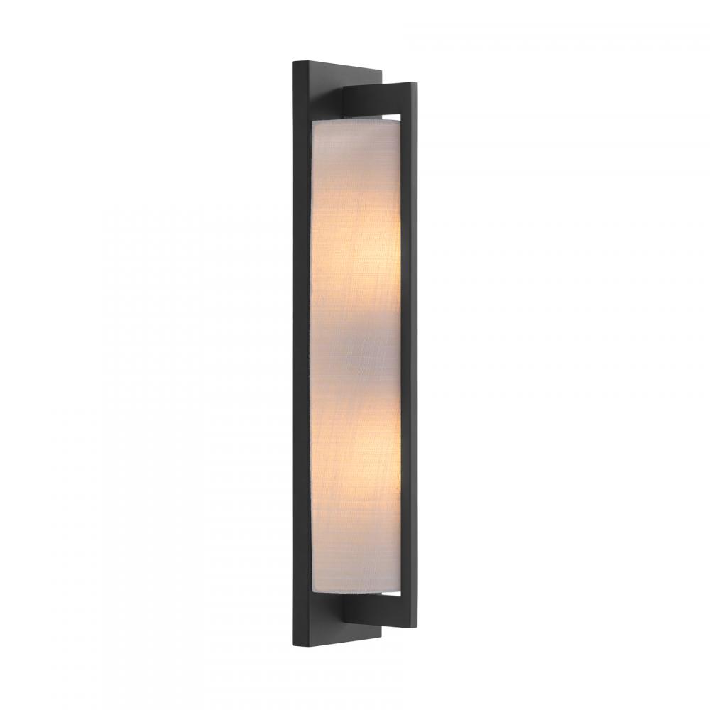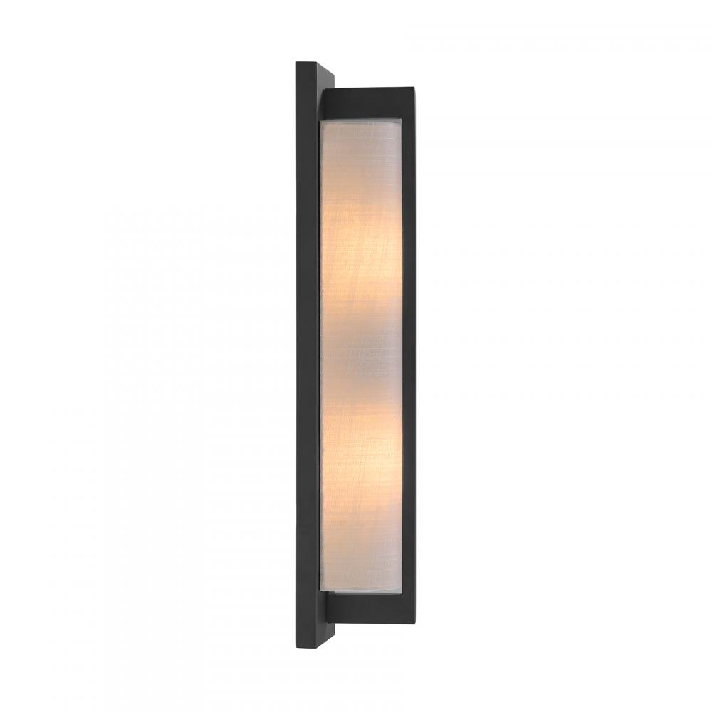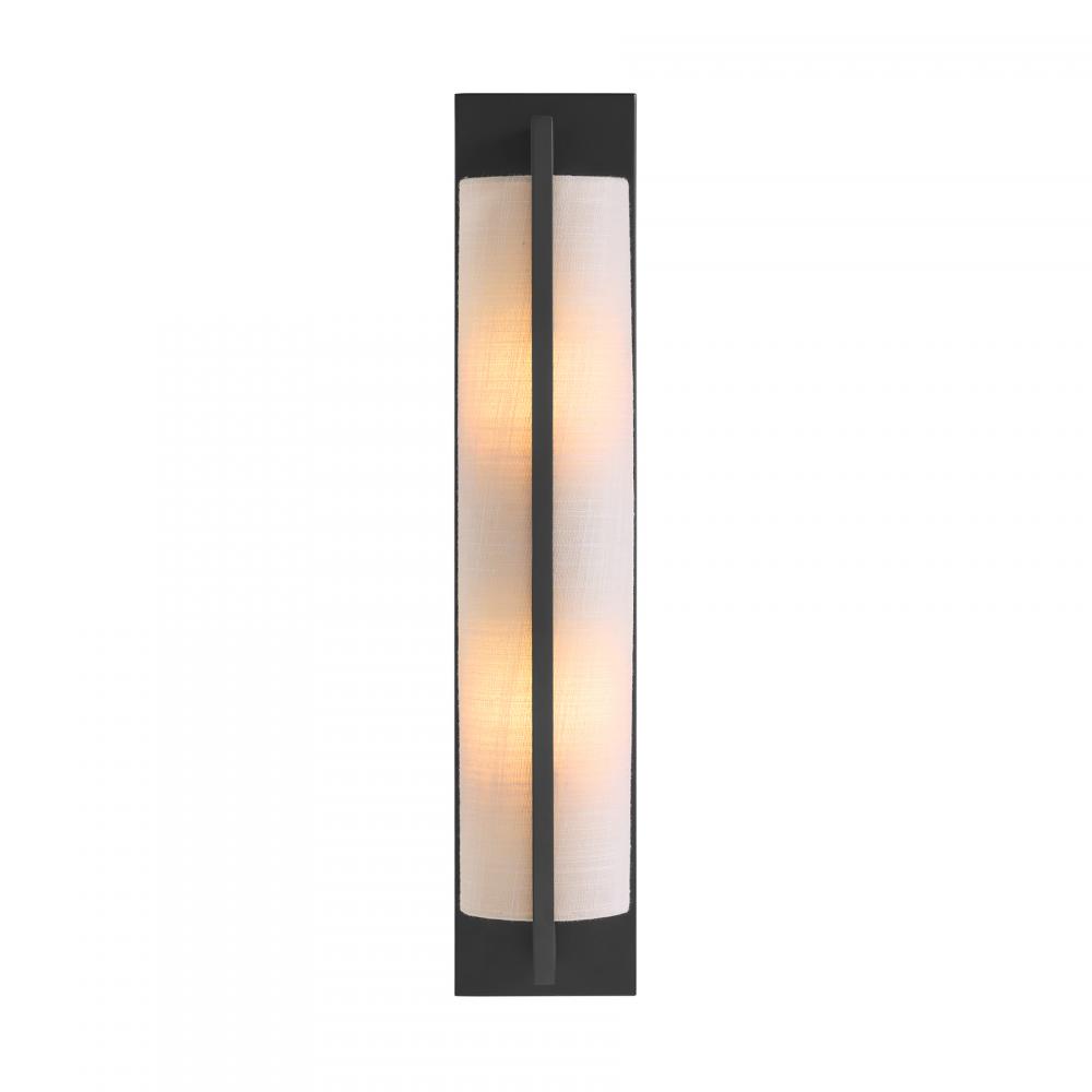 The Savoy House Carver 2-light sconce is oh so sleek and oh so chic. A long, tall white fabric shade is held to the backplate by an arm that overlaps the shade to create a sense of symmetry and is decorated with a Matte Black finish. Carver is 22" in height, 4.5" in width and extends 4" from the wall. Uses two candelabra size bulbs of up to 40 watts per bulb. Bulbs not included.