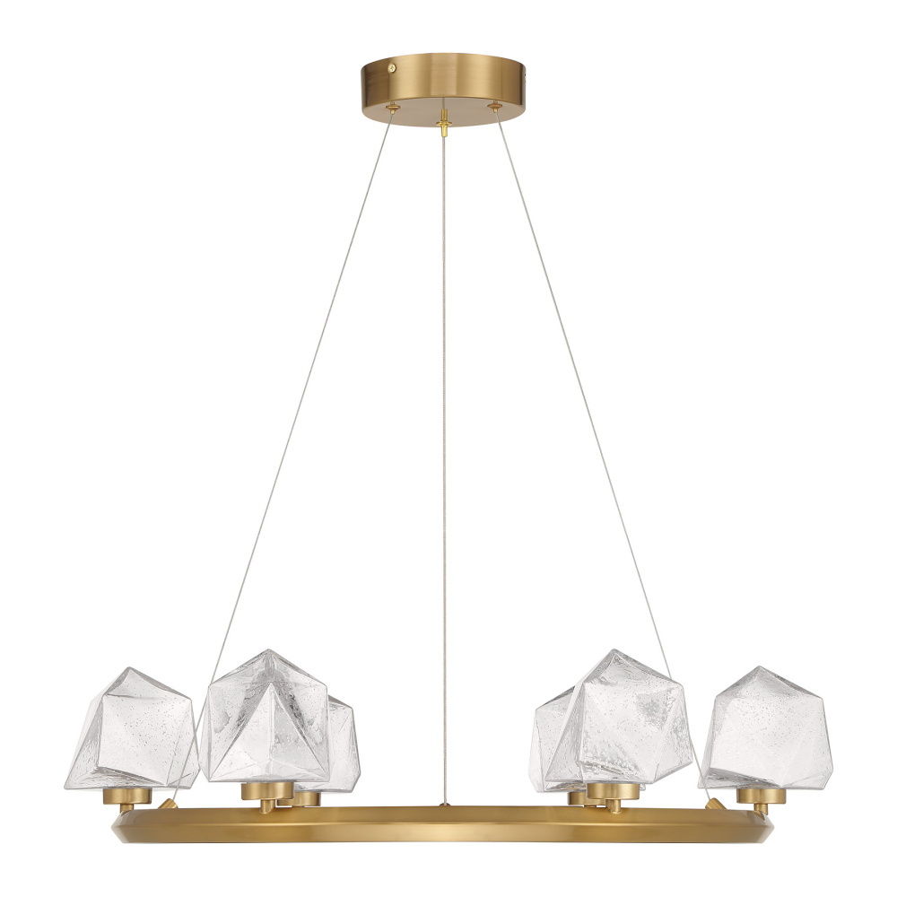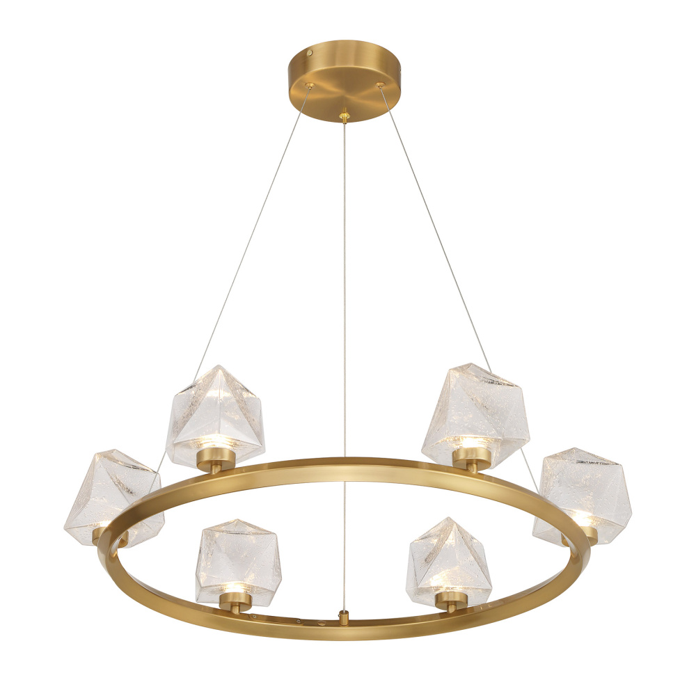 The Castello 6-light chandelier from Savoy House is cool as ice! Its sharply cut shades of clear hammered glass add a bright touch of geometry and texture, pairing perfectly with the thick hoop-shaped structure that is finished in Warm Brass. When the glass is illuminated by the integrated LED light sources, it will truly shine. Super slender hanging cords ensure that your attention stays on the sleek, contemporary design. Castello is 26.5" in width and has an adjustable height ranging from 6" to 126".