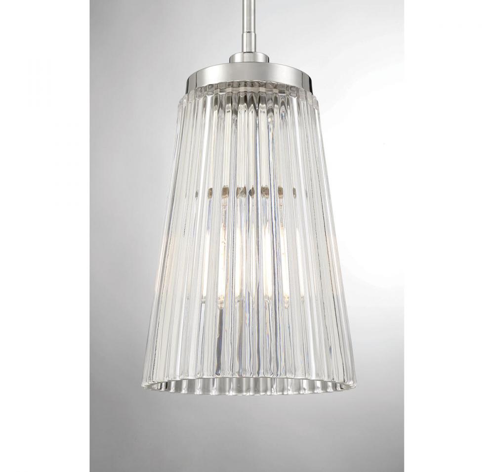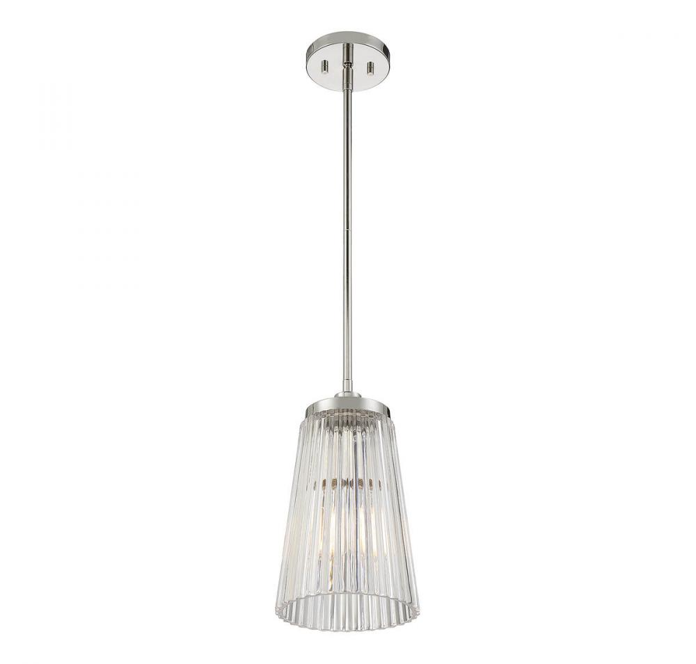 A textured, eye-catching shade of clear ribbed glass takes center stage in the Chantilly 1-light pendant from Savoy House. Finished in polished nickel. Chantilly is 8" in diameter and it has an adjustable height ranging from 22.5" to 41.5". It uses one standard size bulb with a max of 60 watts. Comes with three 9.5" downrods, plus 120" of cord.