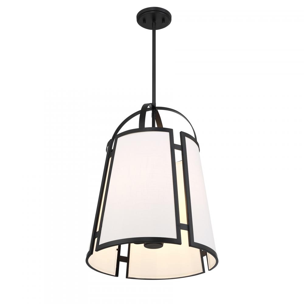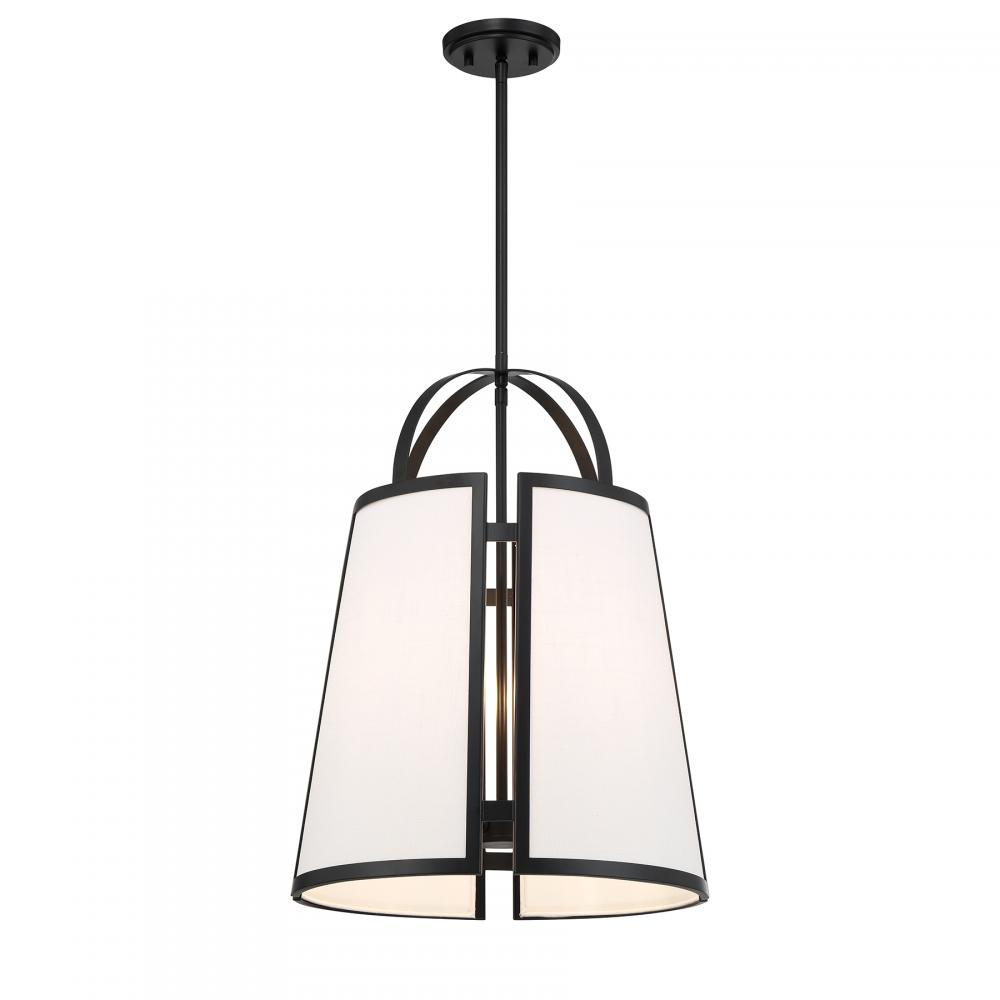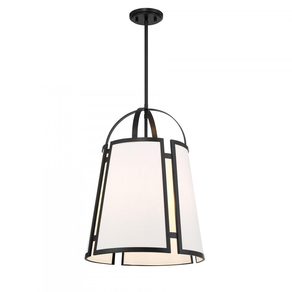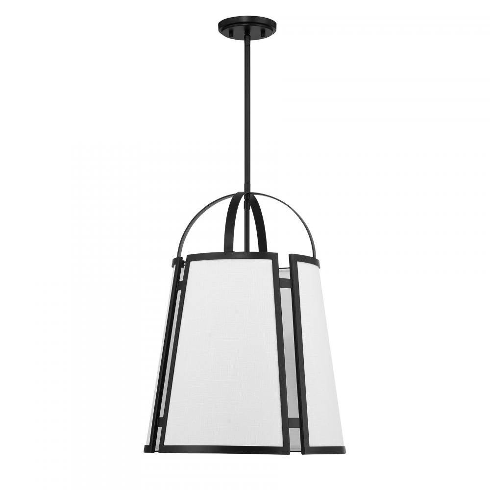 Add a prim and polished look to your home with the Savoy House Chartwell 4-light pendant. The uniquely intriguing shade flaunts cutaway detailing and panes with white linen fabric. Two flat, slim bands help to connect the shade to the downrod. Matte Black finish. Chartwell is 16.75" in width and has an adjustable height ranging from 22.5" to 76.5". Comes with four 12" downrods and one 6" downrod. Uses four candelabra size bulbs of up to 60 watts per bulb. Bulbs not included.