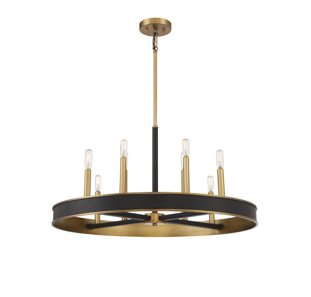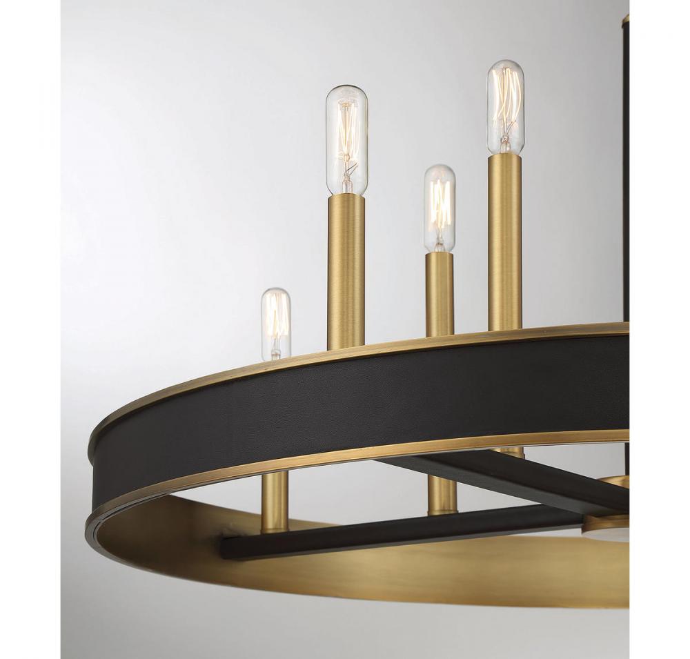 For the Chaucer 8-light chandelier, Savoy House took intriguing streamlined contemporary style and gave it a rugged twist. Smooth accents of chocolate leather adorn the fixture’s central ring, as well as part of the rod. The chocolate leather and warm brass finish look perfect together. Chaucer is 30" in width and has an adjustable height ranging from 21" to 67". It uses eight candelabra-size bulbs of up to 60 watts per bulb. Comes with four 12" downrods and one 6" downrod, plus 80" of cord.