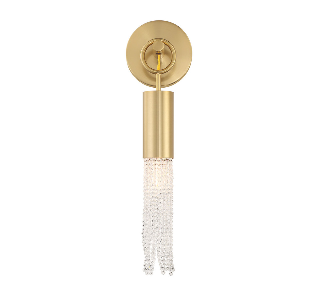 The Savoy House Chelsea 1-light sconce brings understated elegance and sparkle to any space in your home. The light socket, finished in beautiful Warm Brass, is adorned with cascading strands of clear crystal beads that amplify the shimmer and shine. Chelsea is 19" in height, 5" in width and extends 4" from the wall. Uses one standard size bulb of up to 60 watts. Bulb not included.