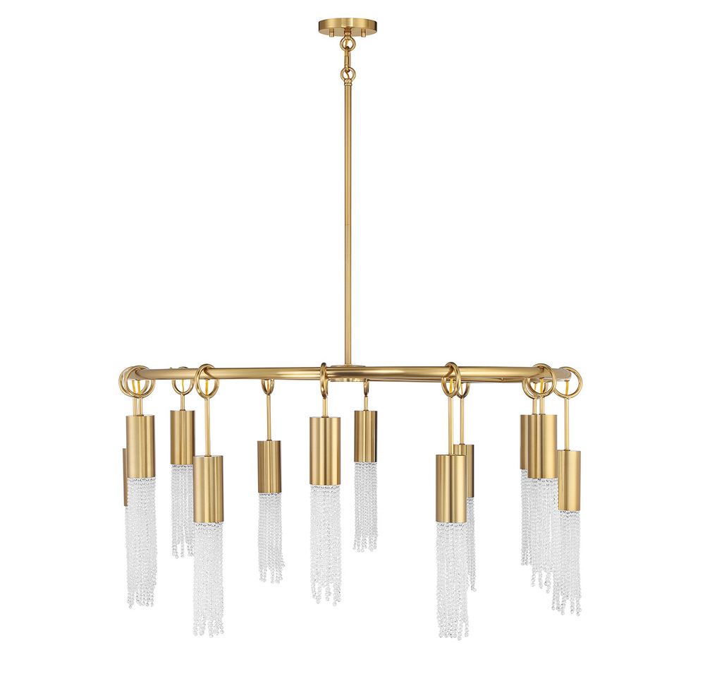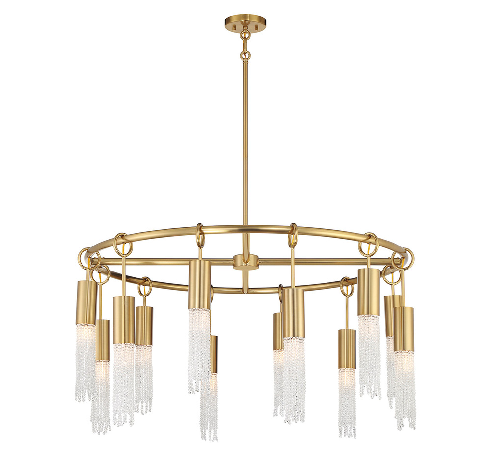 The Savoy House Chelsea 12-light chandelier brings understated elegance and sparkle to your home. Each light socket, finished in beautiful Warm Brass, is adorned with cascading strands of clear crystal beads that amplify the shimmer and shine. Chelsea is 40" in width and has an adjustable height ranging from 20.5" to 74.5". It comes with four 12" downrods and one 6" downrod. Uses twelve standard size bulbs of up to 60 watts per bulb. Bulbs not included.