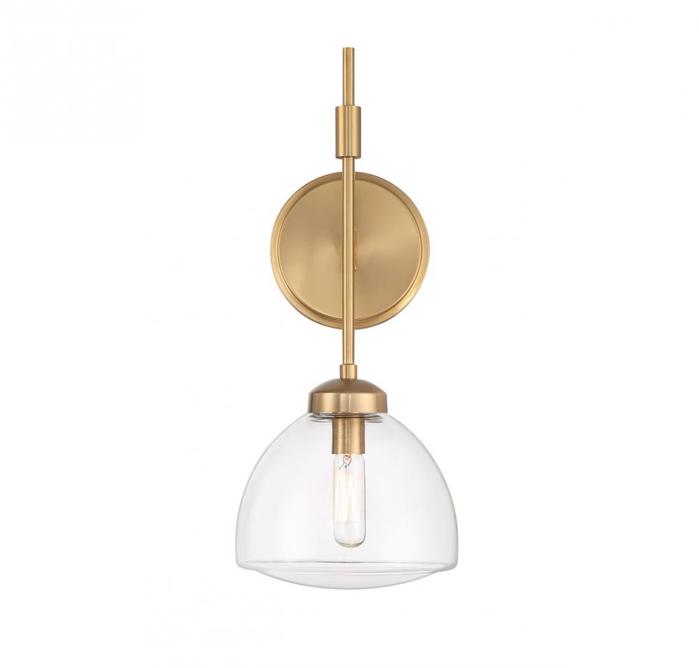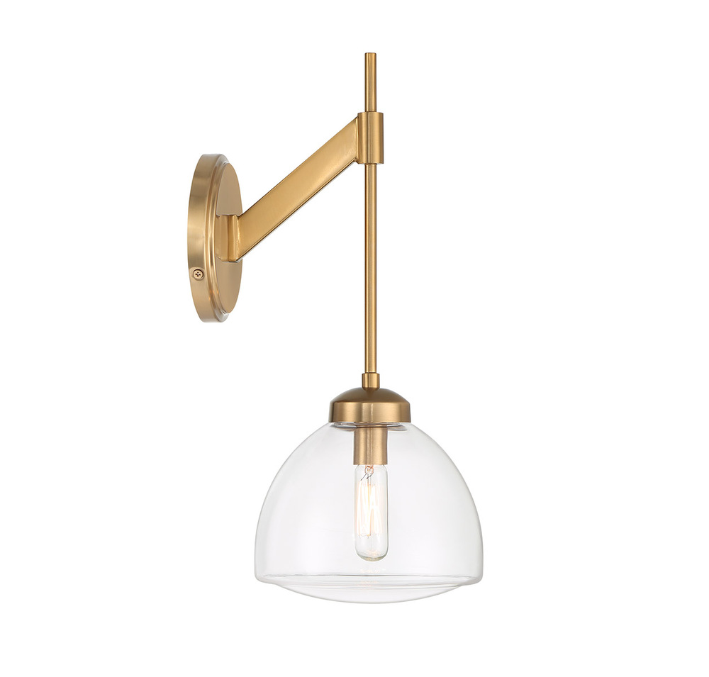 The Savoy House Corbin 1-light sconce brings a crisp, contemporary lighting look to any wall. A molded, curved clear glass shade encases the light source and the Warm Brass finish is beautifully versatile. Corbin is 15" in height, 6.75" in width and extends 8" from the wall. Uses one candelabra size bulb of up to 60 watts. Bulb not included.