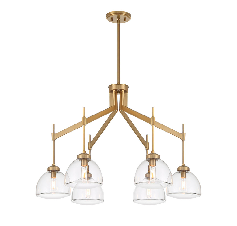 The Savoy House Corbin 6-light chandelier brings a crisp, contemporary lighting look to any space. Molded, curved clear glass shades encase the light sources and the Warm Brass finish is beautifully versatile. Corbin is 31.5" in width and has an adjustable height ranging from 22" to 76". Comes with four 12" downrods and one 6" downrod. Uses six candelabra size bulbs of up to 60 watts per bulb. Bulbs not included.