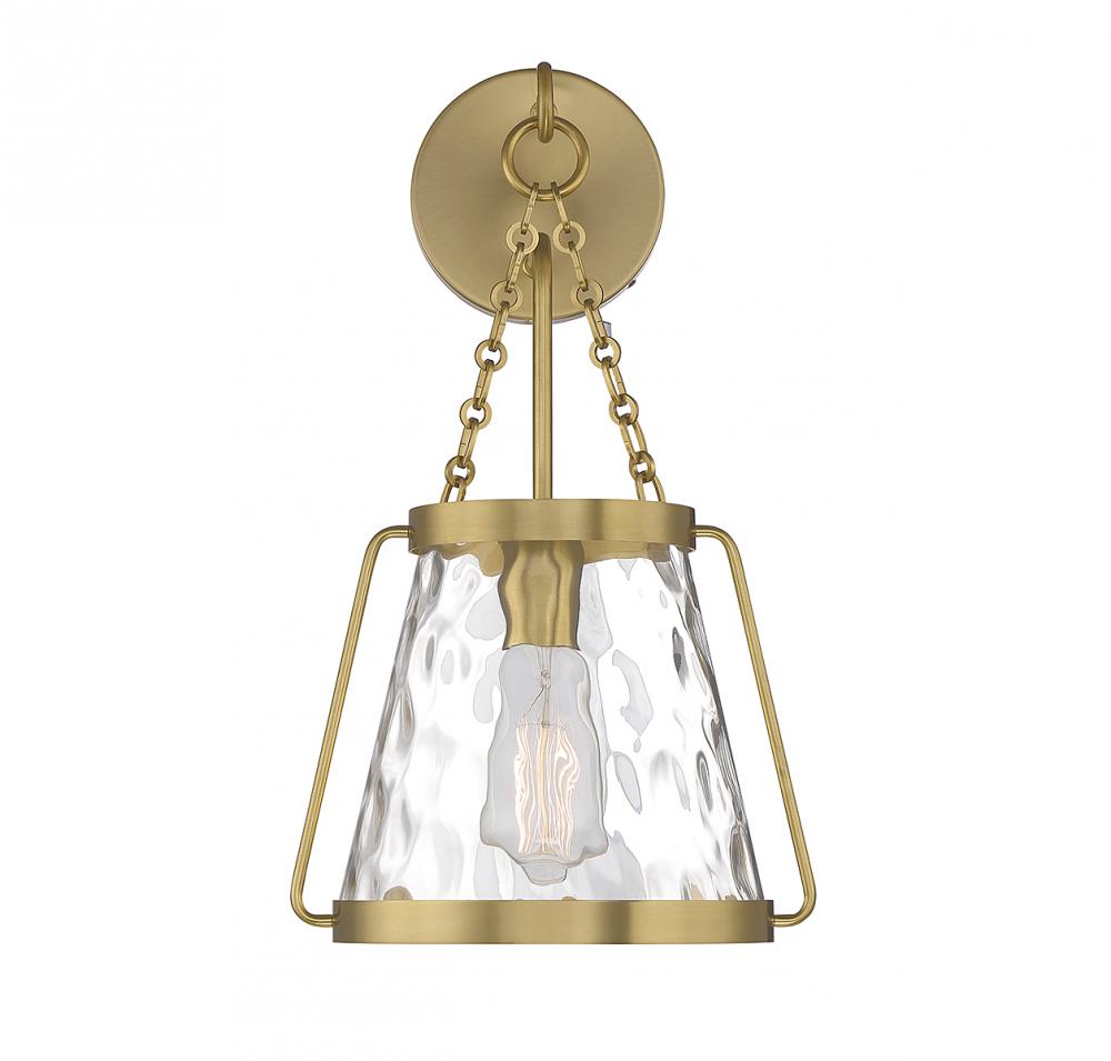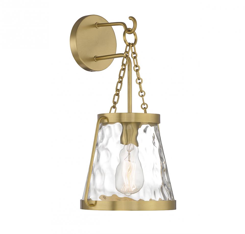 The Savoy House Crawford 1-light wall sconce proves that a classic style can be stunning! A lantern-inspired shade of clear water glass hangs down from an understated structure with industrial-inspired details. Finished in warm brass. Crawford is 17.25" in height, 10" in width and extends 9.25" from the wall. It uses 1 standard size bulb with a max of 60 watts (bulb not included).