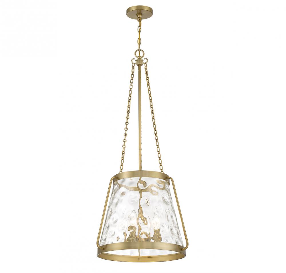 The Savoy House Crawford 4-light pendant proves that a classic style can be stunning! A lantern-inspired shade of clear water glass hangs down from an understated structure with industrial-inspired details. Finished in warm brass. Crawford is 39.5” in height and 18” in width. It uses 4 candelabra size bulbs of up to 60 watts per bulb (bulbs not included).