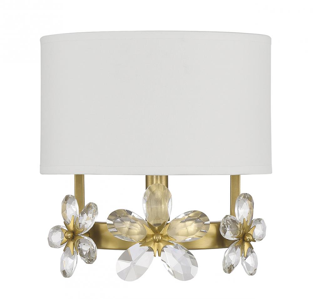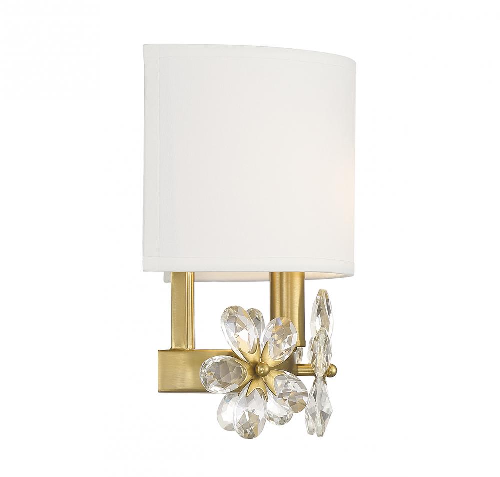 Give your home its flowers with the whimsical Savoy House Dahlia 1-light sconce. Its streamlined structure is decorated with clear crystal flowers to create a look that is always fresh and fun, whether the light is on or off. Finished in warm brass with a white shade. Dahlia is 9.25" in height, 9" in width and extends 5" from the wall. It uses 1 candelabra size bulb of up to 60 watts (bulb not included).