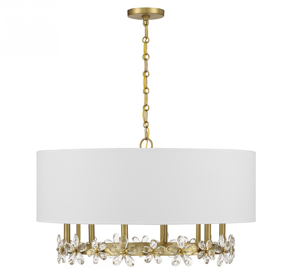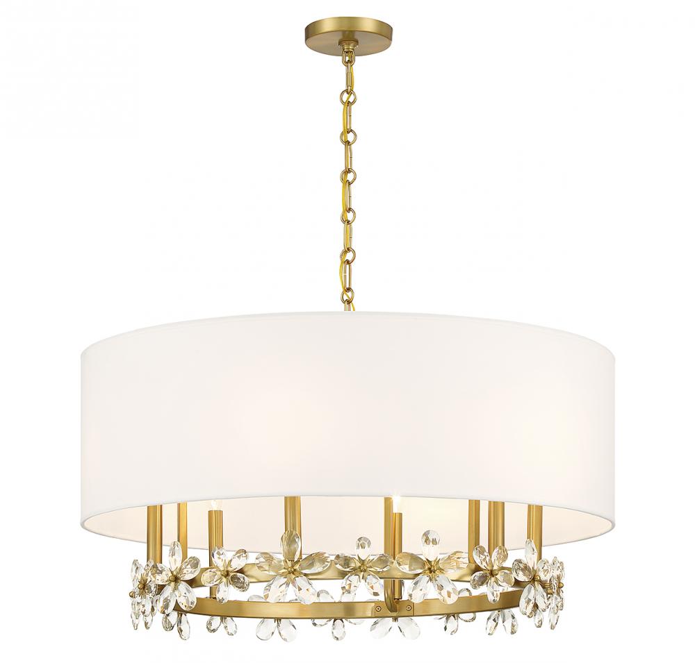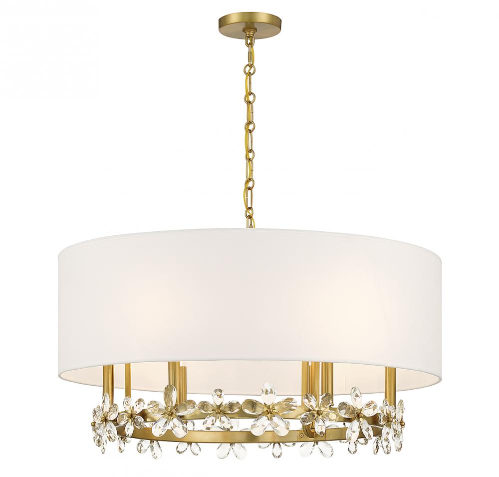 Give your home its flowers with the whimsical Savoy House Dahlia 6-light pendant. Its streamlined structure is decorated with clear crystal flowers to create a look that is always fresh and fun, whether the light is on or off. Finished in warm brass with a white shade. Dahlia is 16.50" in height and 30" in width. It uses 6 candelabra size bulbs of up to 60 watts per bulb (bulbs not included).