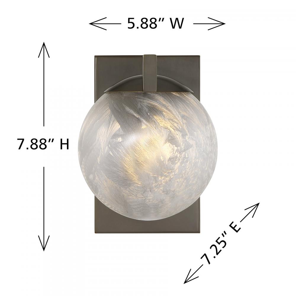 The Savoy House Darien is a 1-light sconce with fabulously chilly appeal. A minimal frame is finished in bold New Bronze and holds an orb of Ice Glass, adding sub-zero cool with tons of frosty texture. Darien is 7.88" in height, 5.88" in width and extends 7.25" from the wall. Uses one candelabra size bulb of up to 60 watts. Bulb not included. This sconce is damp area rated.