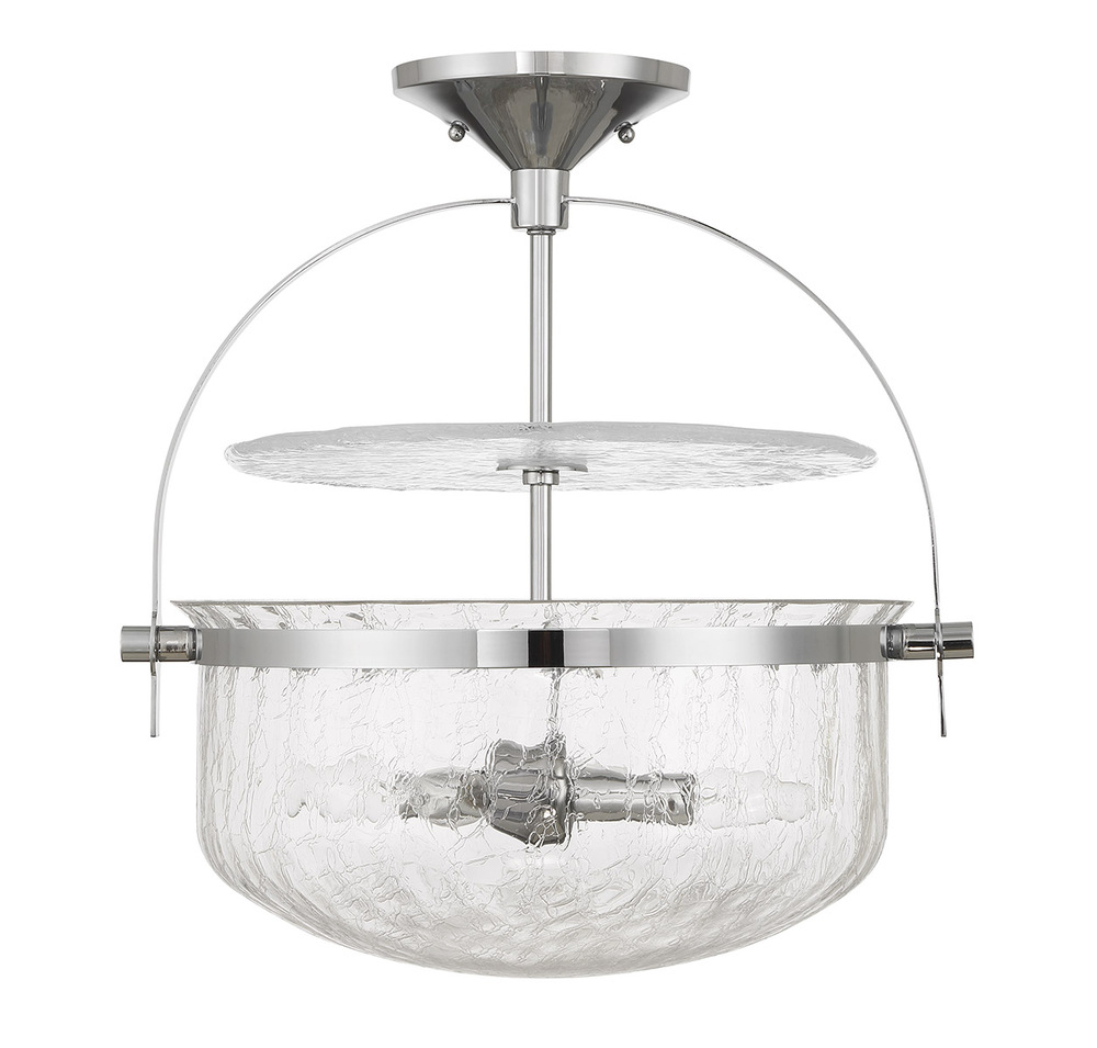 The Savoy House Denmar 4-light convertible semi-flush mount perfectly illuminates a wide variety of spaces with its classic style. It also has superior versatility because it can be used as a hanging pendant or ceiling light! The shade and diffuser of crackled glass bring eye-catching texture while the Chrome finish adds sleekness. Denmar is 18" in width and has an adjustable height ranging from 19" to 73". Comes with four 12" downrods and one 6" downrod. Uses four candelabra size bulbs of up to 60 watts per bulb. Bulbs not included.