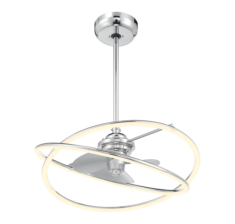 Cool and cutting-edge, the Savoy House Dorado Fan D'Lier reinvents the chandelier and the ceiling fan in one fabulously fashionable fixture. Bands of integrated LED light encircle the fan, which is finished in Polished Chrome. Dorado uses an efficient DC motor and has a handheld remote control for extra convenience. It is 25" in width and 10.5" in height. Comes with a 4" downrod and an 18" downrod. Fan D'Liers are a Savoy House exclusive. These custom designs are inspired by high-end designer styles and take top trends to a whole new level.