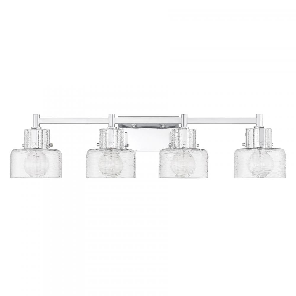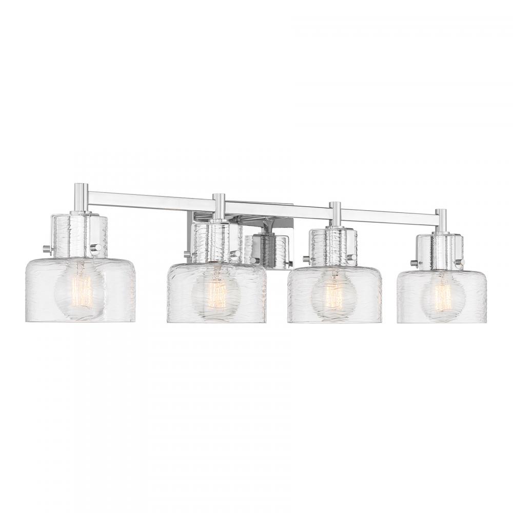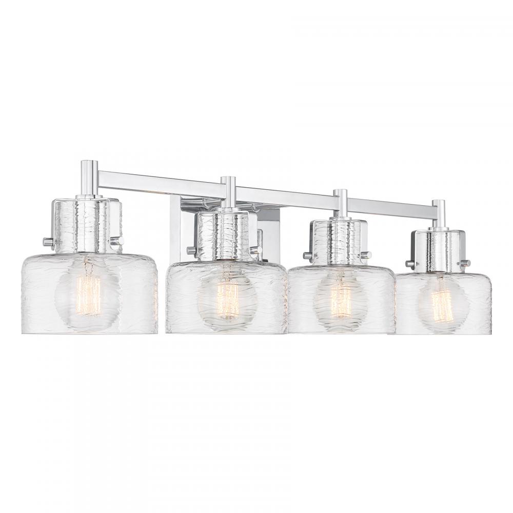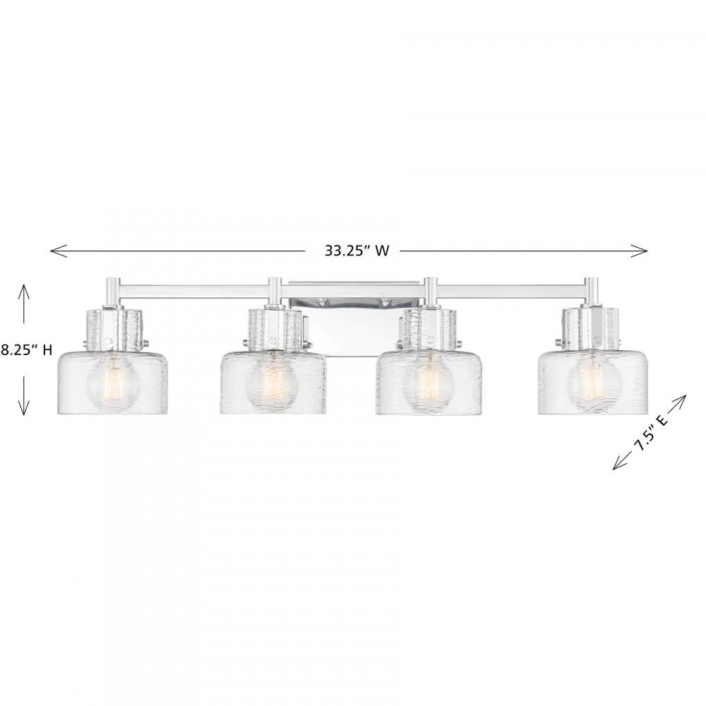 The Savoy House Dover 4-light bath light showcases standout bathroom lighting style! Clear glass shades feature a beautifully textured pattern that recalls ocean waves. These glass shades are held to the base by arms that are finished in Chrome and decorated with visible hardware to add a hint of vintage inspiration. Dover is 8.25" in height, 33.25" in width and extends 7.5" from the wall. It uses four standard size bulbs of up to 60 watts per bulb. Bulbs not included. Install as pictured. This bath bar is damp area rated.