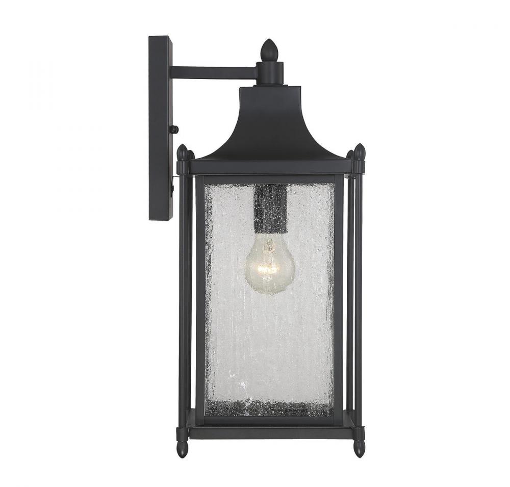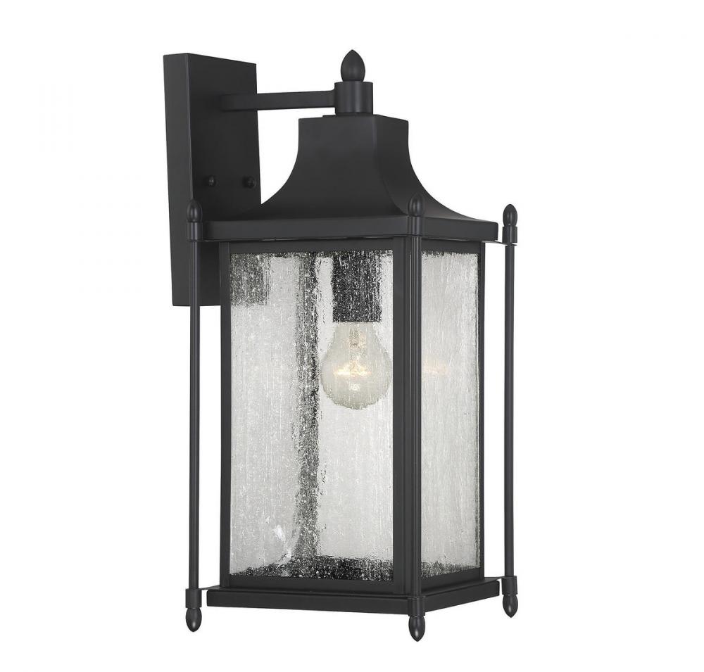 Featuring a design that is classic Americana, this Savoy House Dunnmore 1-light outdoor wall light adds timeless elegance to the outdoor areas of your home. A high quality black finish blends incredibly well with many other hardware types and architectural materials. The traditional box shape is enhanced with slim outer columns, delightful finials and a graceful curved mansard roof. Panes of beautiful clear seeded glass add to the vintage charm and this wall lantern holds one 60W standard size bulb for ample, safe and welcoming illumination. It’s 8" wide, 18" high and UL rated for wet locations, so it's perfect to give inviting, classic style to your porch, patio, sunroom, pergola or other walls of your outdoor living areas.