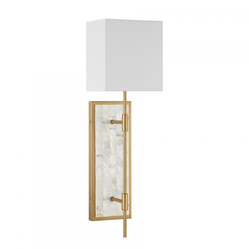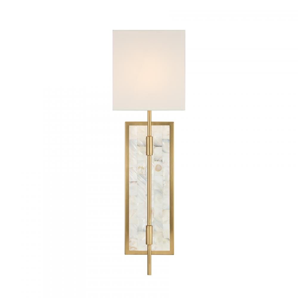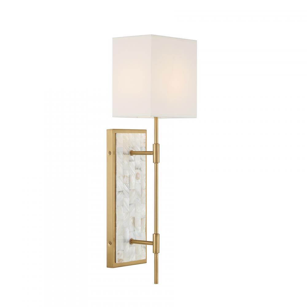 A mosaic of natural capiz shell decorates the backplate on this Savoy House Eastover 1-light sconce. Each piece of capiz is unique, so you may notice striping, striations or other details that come with the perfect imperfection of nature. When the shell catches the light, which is softened by a crisp white fabric shade, it will truly shimmer and shine. Finished in Warm Brass. Eastover is 22" in height, 6.5" in width and extends 6.25" from the wall. Uses one candelabra size bulb of up to 60 watts. The bulb is not included. This sconce is damp area rated, making it perfect for use in bathroom lighting projects.