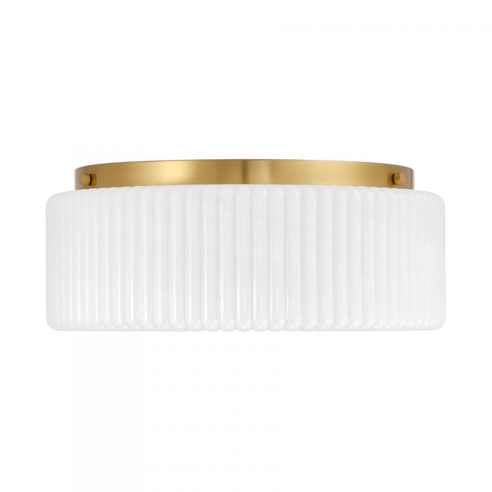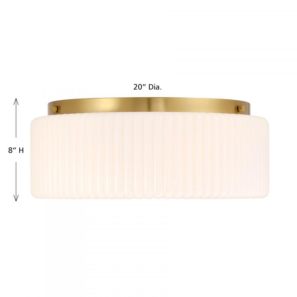 Use the vintage-inspired Savoy House Edgemont 4-light flush mount to add beautiful, vivid brightness to any room! The ribbed shade of strie glass brings in a big dose of eye-catching texture and the Warm Brass finish is extremely versatile. Edgemont is 8" in height and 20" in width, making it an excellent option for larger spaces. It uses four standard size bulbs of up to 60 watts per bulb. Bulbs not included.