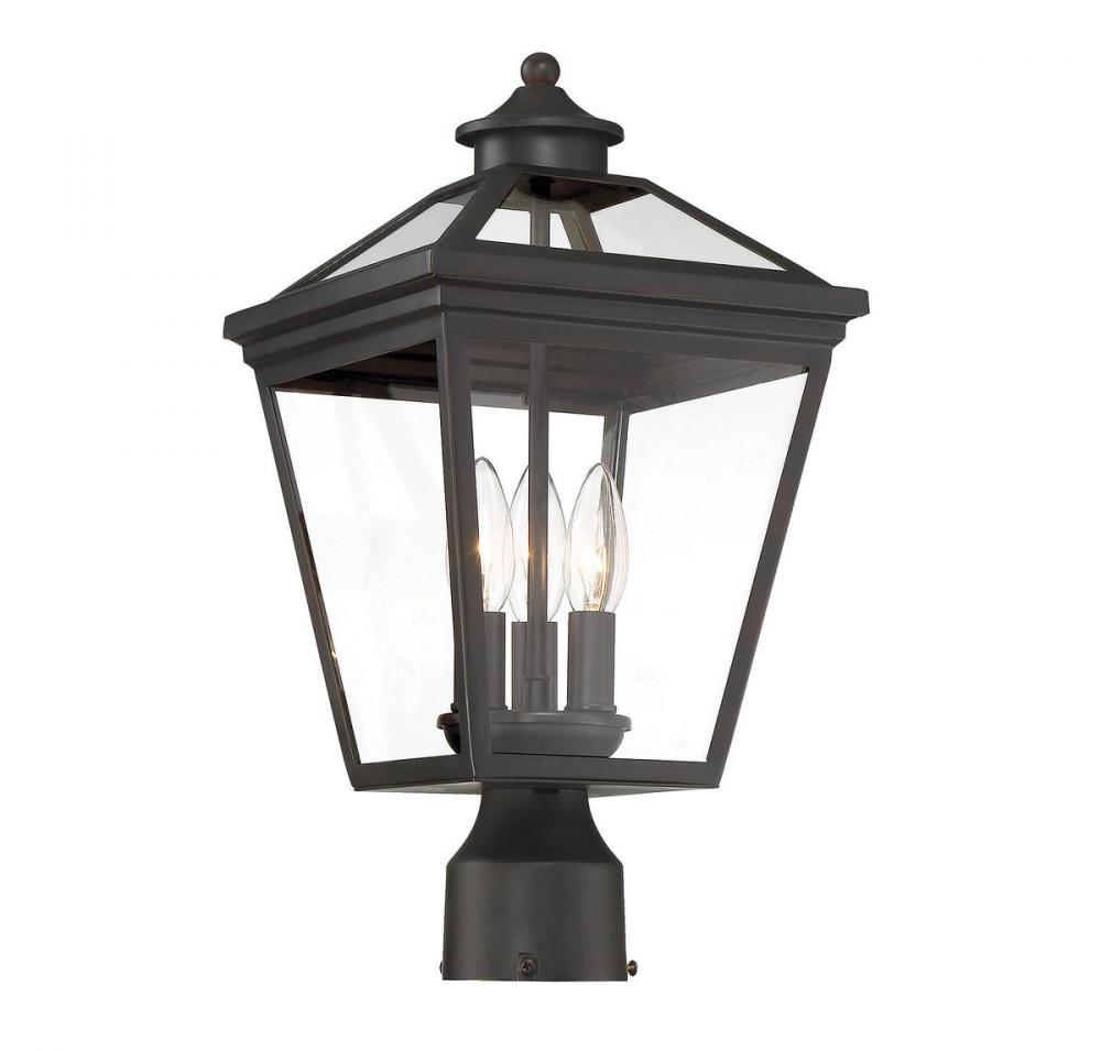 Brighten the exterior of your home and welcome your guests in style with the Savoy House Ellijay 3-light outdoor post lantern. The design mimics a vintage gas lantern with a classic tapered box shape and decorative top finial. A sumptuous English bronze finish adds traditional flair and blends well with other hardware and architectural materials. Panes of clear glass fill all four side panels and the roof panels, too. Three 40W candelabra size bulbs provide inviting and secure illumination. This lantern measures 9" wide and 17.5" high.