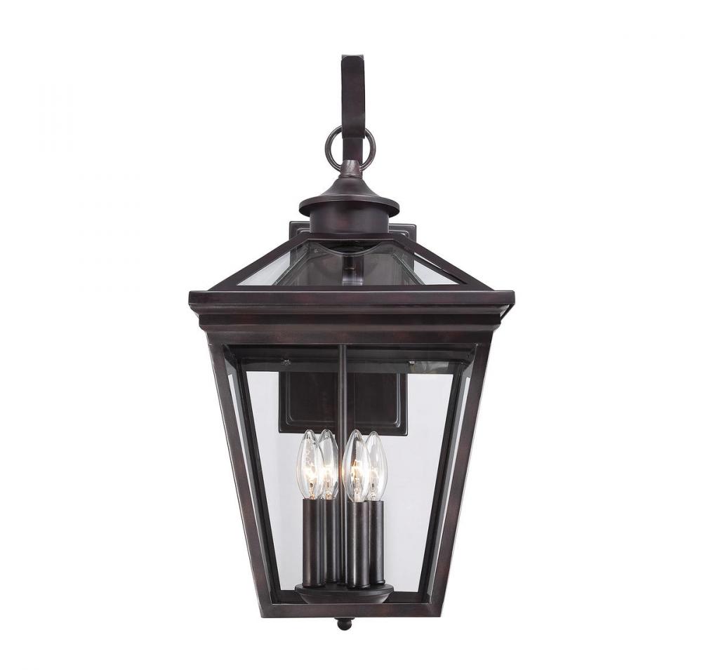 Brighten the exterior of your home and welcome your guests in style with the Savoy House Ellijay 4-light outdoor wall lantern. The design mimics a vintage gas lantern with a classic tapered box shape and decorative top finial. A sumptuous English bronze finish adds traditional flair and blends well with other hardware and architectural materials. Panes of clear glass fill all four side panels and the roof panels, too. Four 40W candelabra size bulbs provide inviting and secure illumination. This lantern measures 12" wide, 25.5" high and extends 15" from the wall.