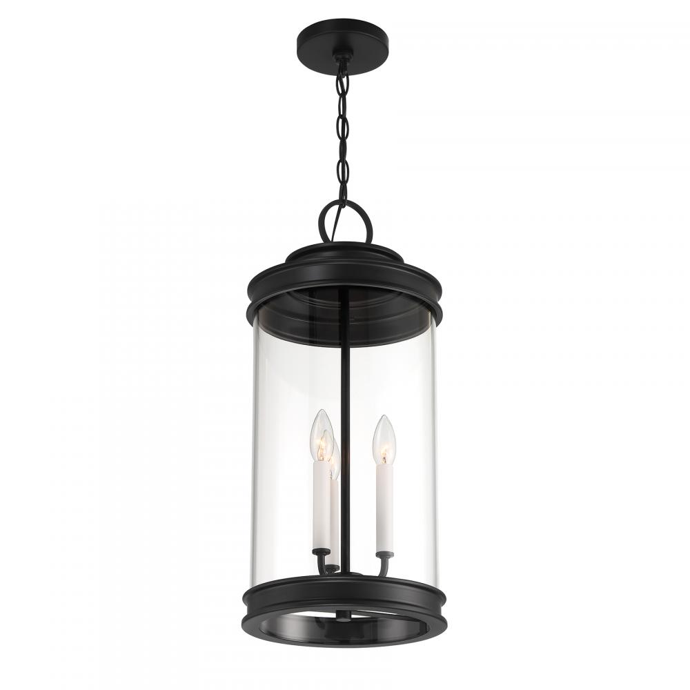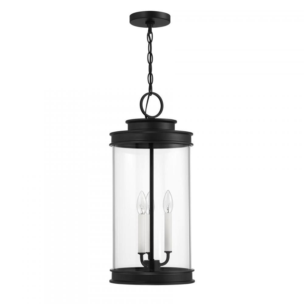 Classic lantern style gets a fresh new look in the Savoy House Englewood 3-light outdoor hanging light. A beautiful cylinder of clear glass is held in a minimally detailed frame finished in timeless Matte Black. White candle covers create a perfect pairing with the finish. Englewood is 23.5" in height and 10.5" in width. Uses three candelabra size bulbs of up to 40 watts per bulb. Bulbs not included. Damp area rated.