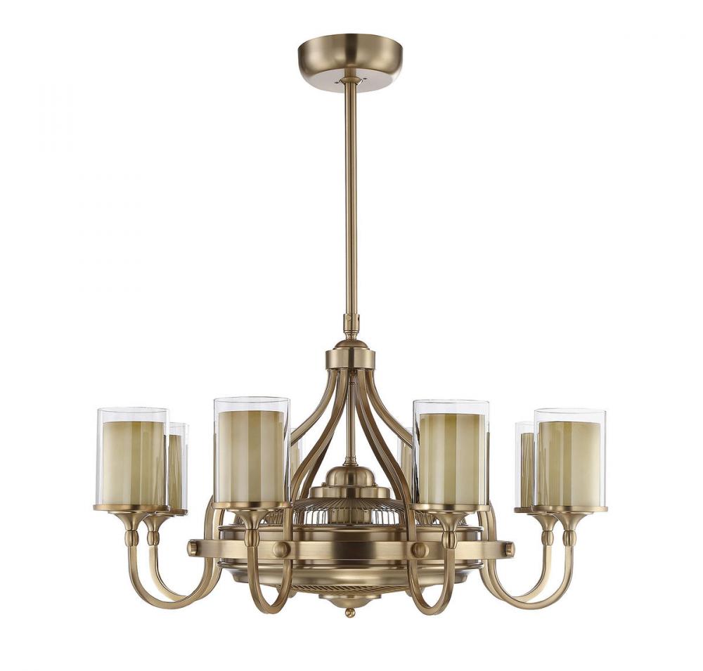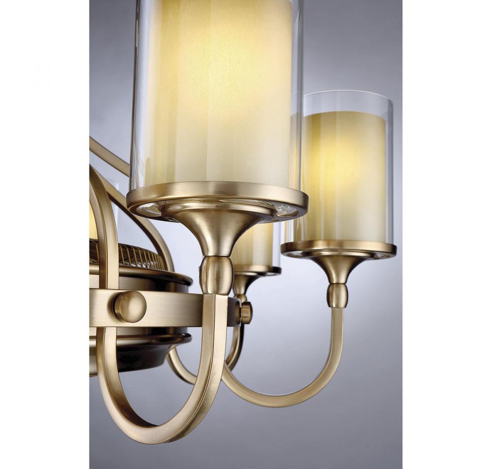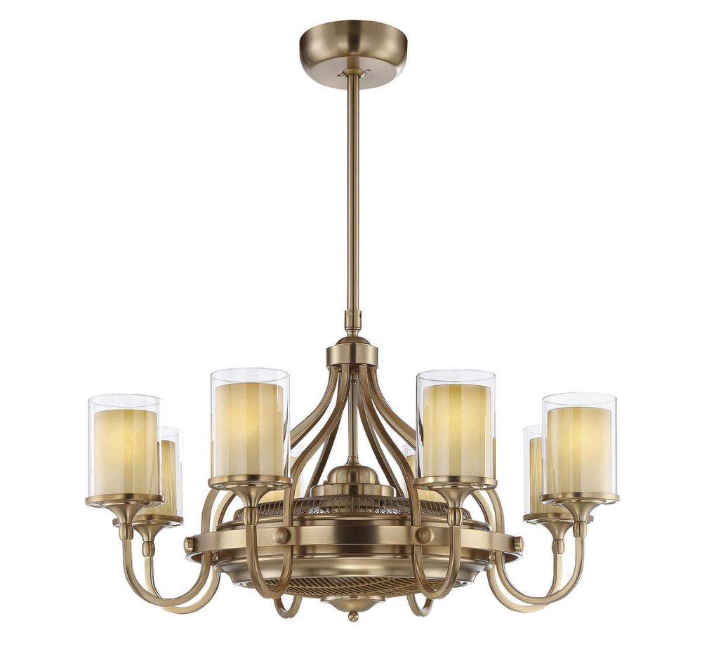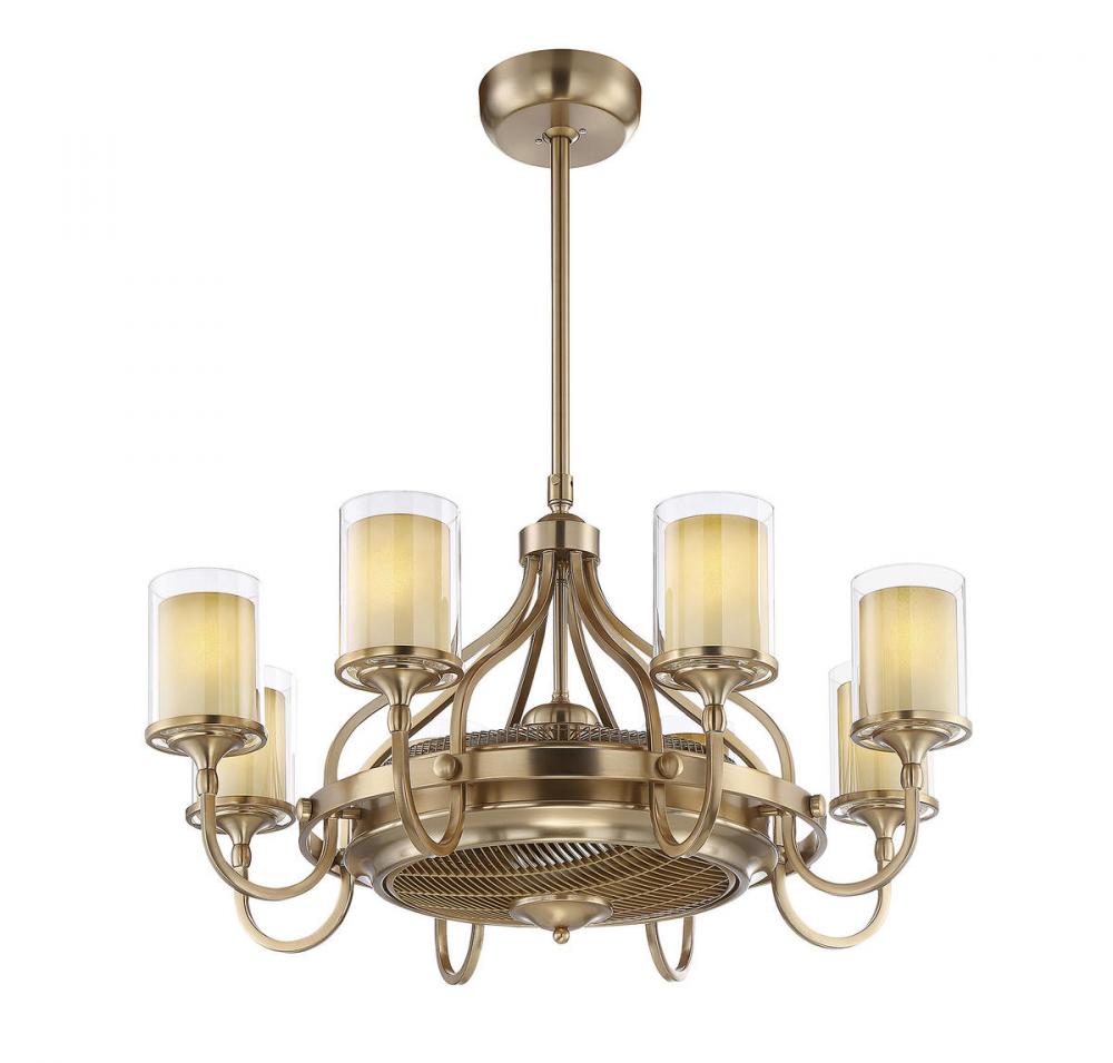 When you’d like both a stylish chandelier and the cooling comfort of a ceiling fan, choose this Savoy House Etesian Fan D'Lier. It’s the perfect combination of practical function and beautiful design for your home. Six graceful, curved arms hold elegant streamlined candle cups, with nicely decorative details. The circular fan housing has a refined, two-tier design and delightful finial and canopy. The entire structure has a gorgeous burnished russet finish. The six shades are beautiful, too, with outer cylinders of clear glass and inners cylinder of cream-colored glass allowing glare-free illumination from the included 6W dimmable LED bulbs. A full function handheld remote is also included, so you have independent control of the light and fan.