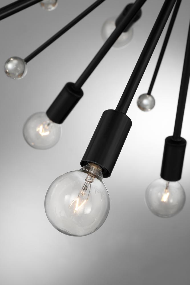 The Savoy House Galea 24-light chandelier is a stunning burst of Sputnik style that also features arms topped with glass baubles to bring in even more sparkle. Finished in sleek matte black. Chandeliers can be used in a wide variety of spaces, including but certainly not limited to dining rooms, living rooms, great rooms, bedrooms, kitchens, foyers, offices and even closets! The hanging height is adjustable and this fixture can be mounted on a sloped ceiling. Since the bulbs are exposed, try using stylized bulbs (not included) like tubular shape or Edison style for a different look! The polished nickel finish can be matched with nickel hardware or mixed with hardware in other finishes. With its Sputnik allure, Galea is perfect for those who love mid-century modern style, but it’s also a great choice to create pizzazz in contemporary and transitional spaces too. When you choose a Savoy House lighting fixture, you can be certain you've selected a piece that will withstand the test of time.